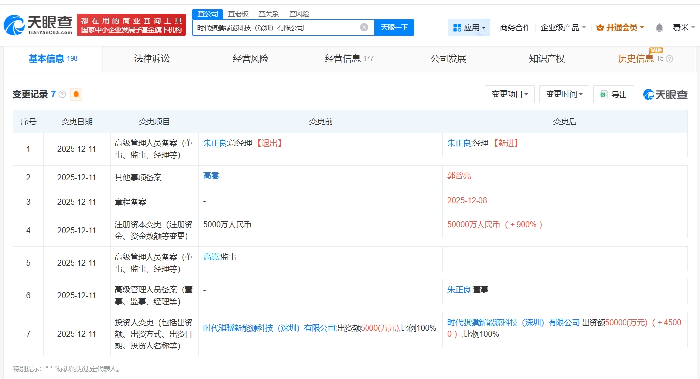 雷达财经讯,天眼查App显示,近日,时代骐骥绿能科技(深圳)有限公司发生工商变更,注册资本由5000万人民币增至5亿人民币,增幅900%,同时发生高管变更。