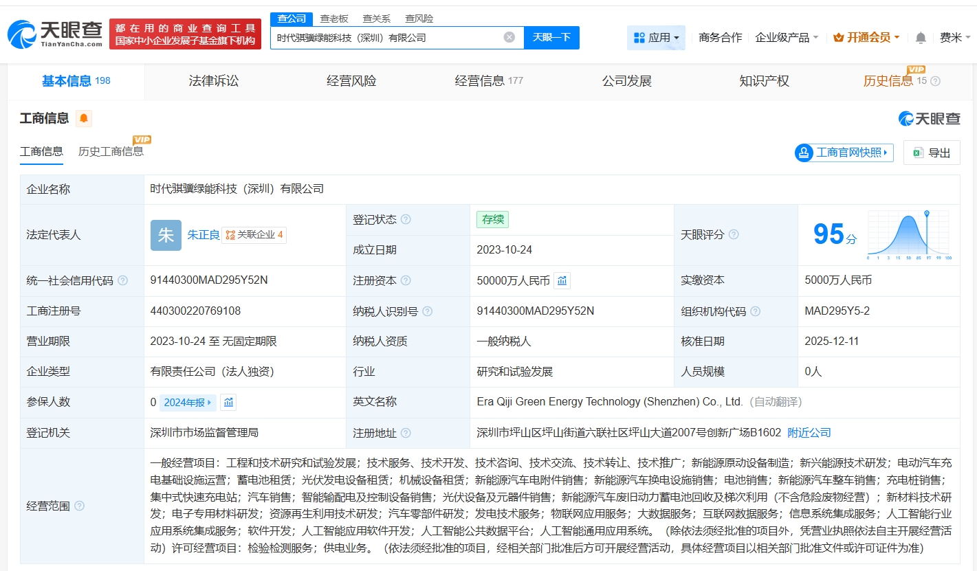 该公司成立于2023年10月,法定代表人朱正良,经营范围包括工程和技术研究和试验发展、新能源原动设备制造、新兴能源技术研发等,由宁德时代(300750)旗下时代骐骥新能源科技(深圳)有限公司全资持股。