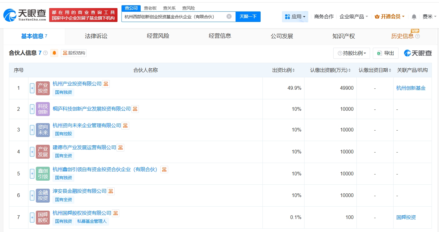 雷达财经讯,天眼查App显示,近日,杭州西部创新创业投资基金合伙企业(有限合伙)成立,执行事务合伙人为杭州国舜股权投资有限公司,出资额10亿人民币,经营范围为创业投资,由杭州产业投资有限公司、桐庐科技创新产业发展投资有限公司、杭州资向未来企业管理有限公司等共同出资。