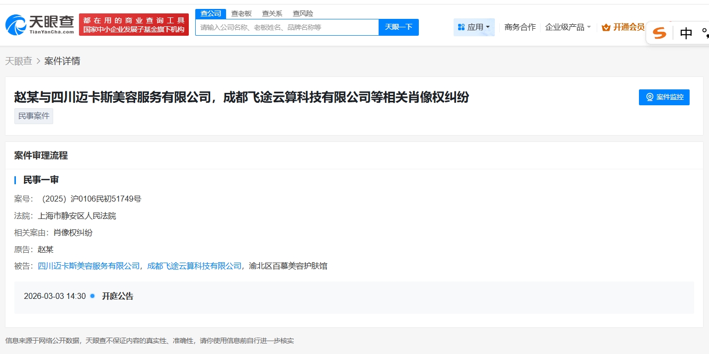 雷达财经讯,天眼查App显示,近日,赵丽颖与四川迈卡斯美容服务有限公司、成都飞途云算科技有限公司、渝北区百慕美容护肤馆相关肖像权纠纷案件新增一则开庭公告,原告为赵丽颖,该案将于2026年3月3日在上海市静安区人民法院开庭审理。