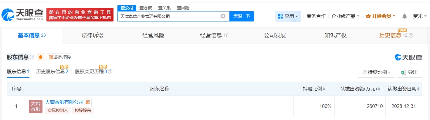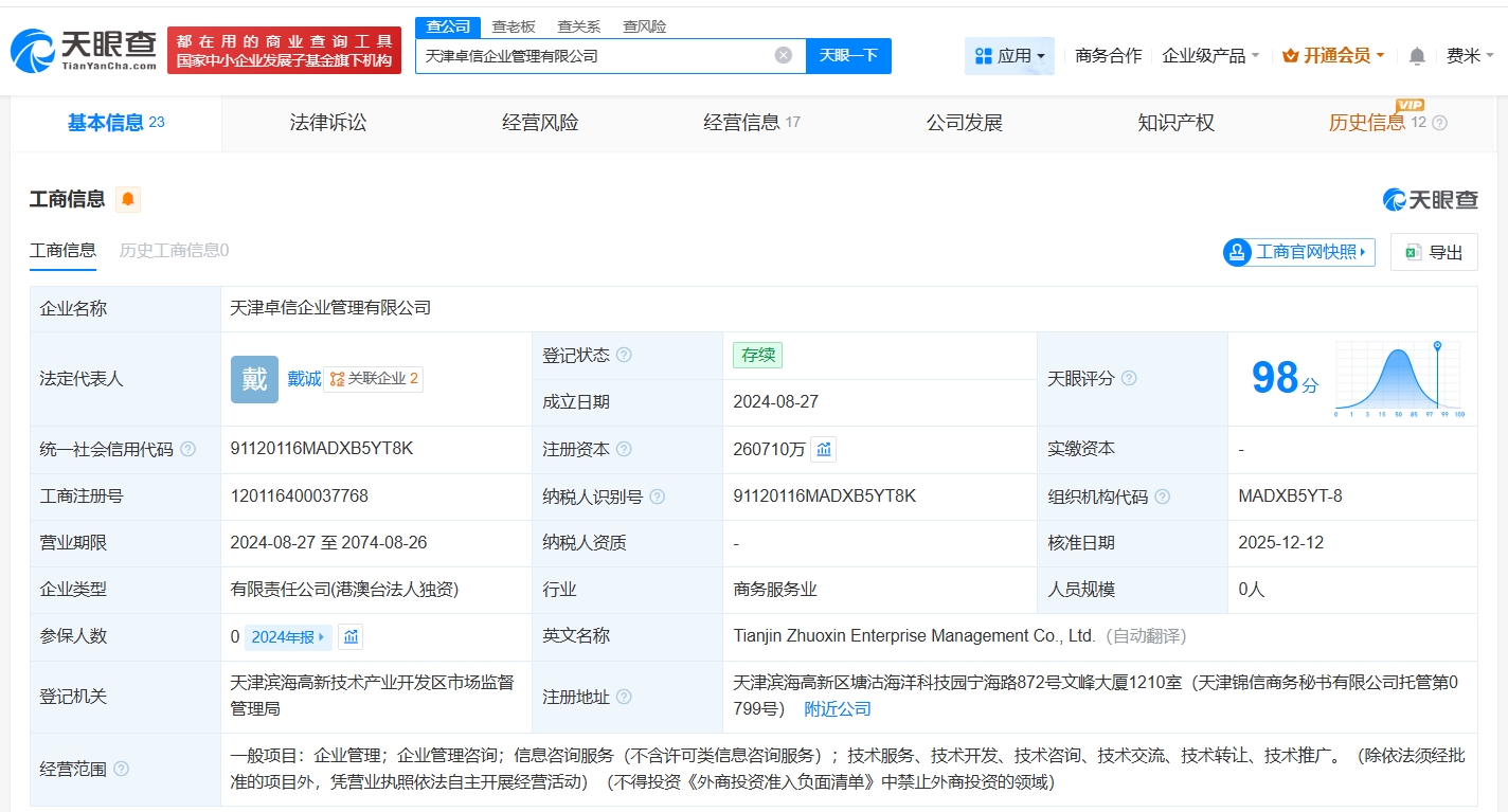 该公司成立于2024年8月,注册资本约26.07亿人民币,经营范围包括企业管理、企业管理咨询、信息咨询服务等,由大窑香港有限公司全资持股。