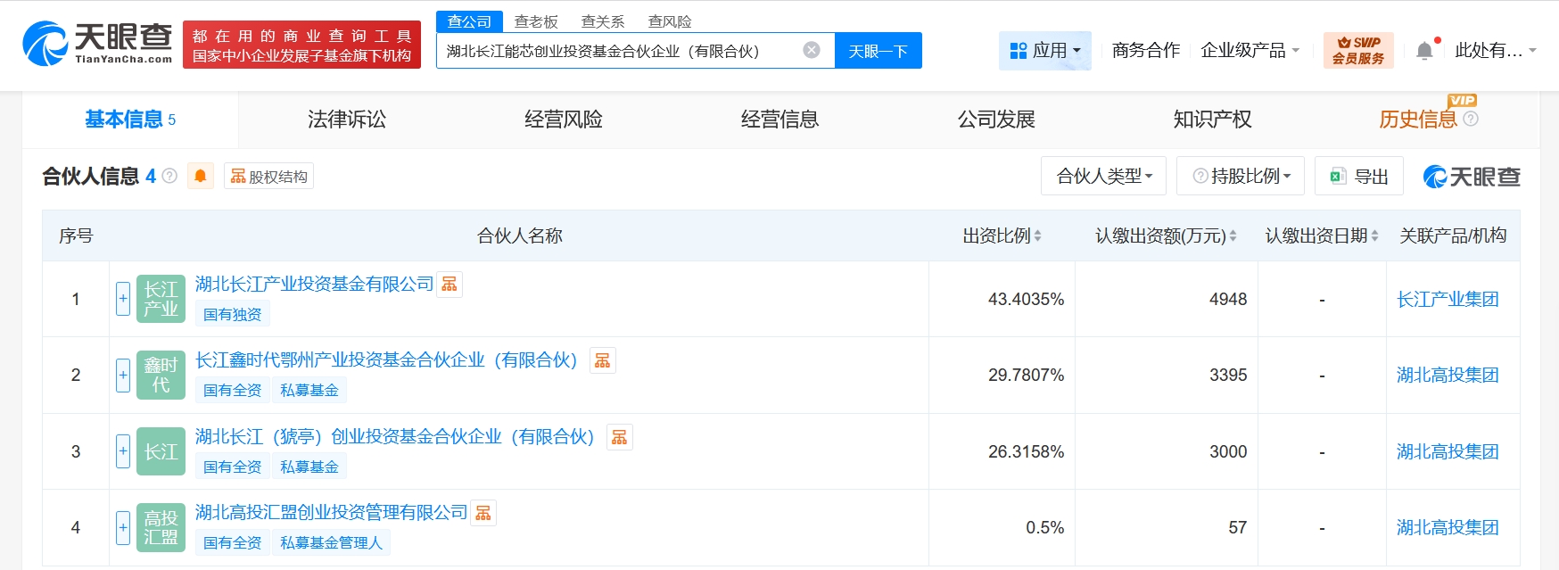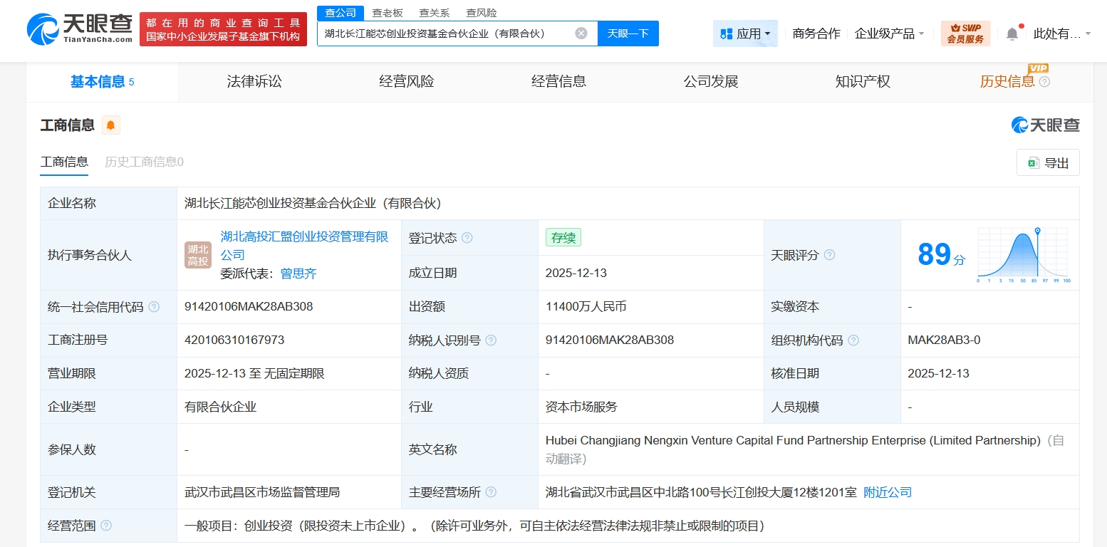雷达财经讯,天眼查App显示,近日,湖北长江能芯创业投资基金合伙企业(有限合伙)成立,执行事务合伙人为湖北高投汇盟创业投资管理有限公司,出资额1.14亿人民币,经营范围为创业投资。合伙人信息显示,该基金由湖北长江产业投资基金有限公司、长江鑫时代鄂州产业投资基金合伙企业(有限合伙)、湖北长江(猇亭)创业投资基金合伙企业(有限合伙)、湖北高投汇盟创业投资管理有限公司共同出资。