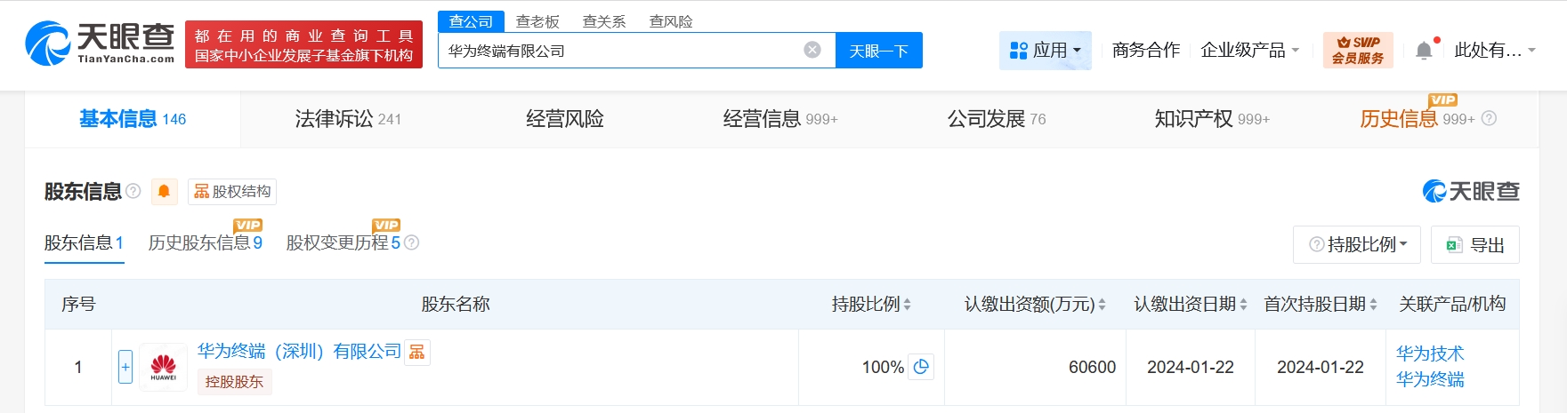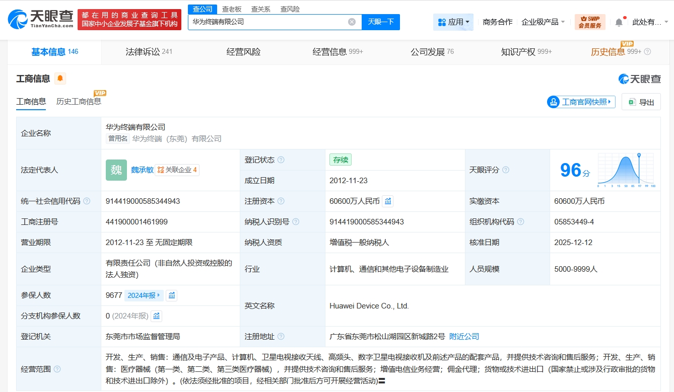 华为终端有限公司成立于2012年11月,法定代表人为魏承敏,注册资本6.06亿人民币,经营范围含开发、生产、销售通信及电子产品、计算机、卫星电视接收天线、高频头、数字卫星电视接收机及前述产品的配套产品,并提供技术咨询和售后服务等。股东信息显示,该公司由华为终端(深圳)有限公司全资持股。