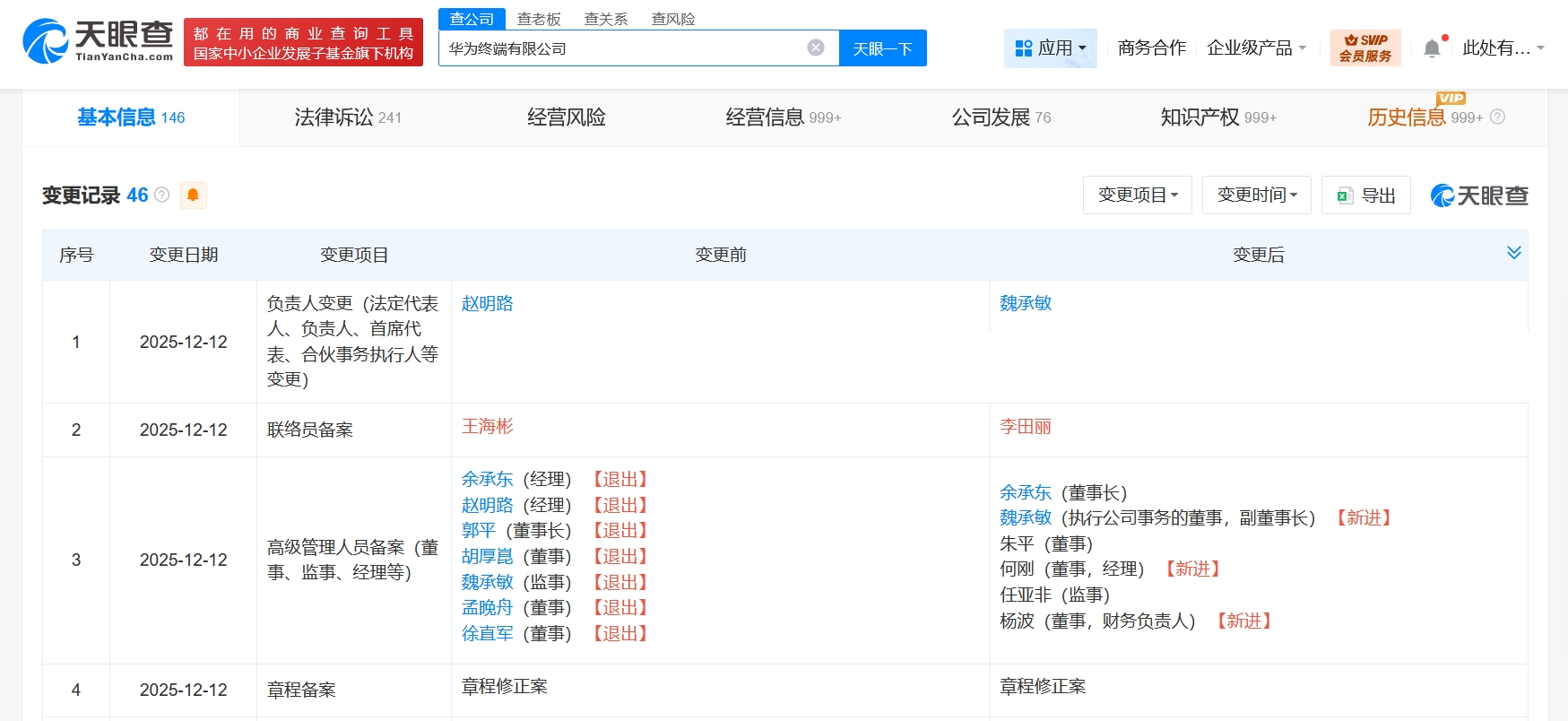 雷达财经讯,天眼查工商信息显示,近日,华为终端有限公司发生工商变更,郭平卸任董事长,由余承东接任,孟晚舟、徐直军等卸任董事,同时,多位高管发生变更。