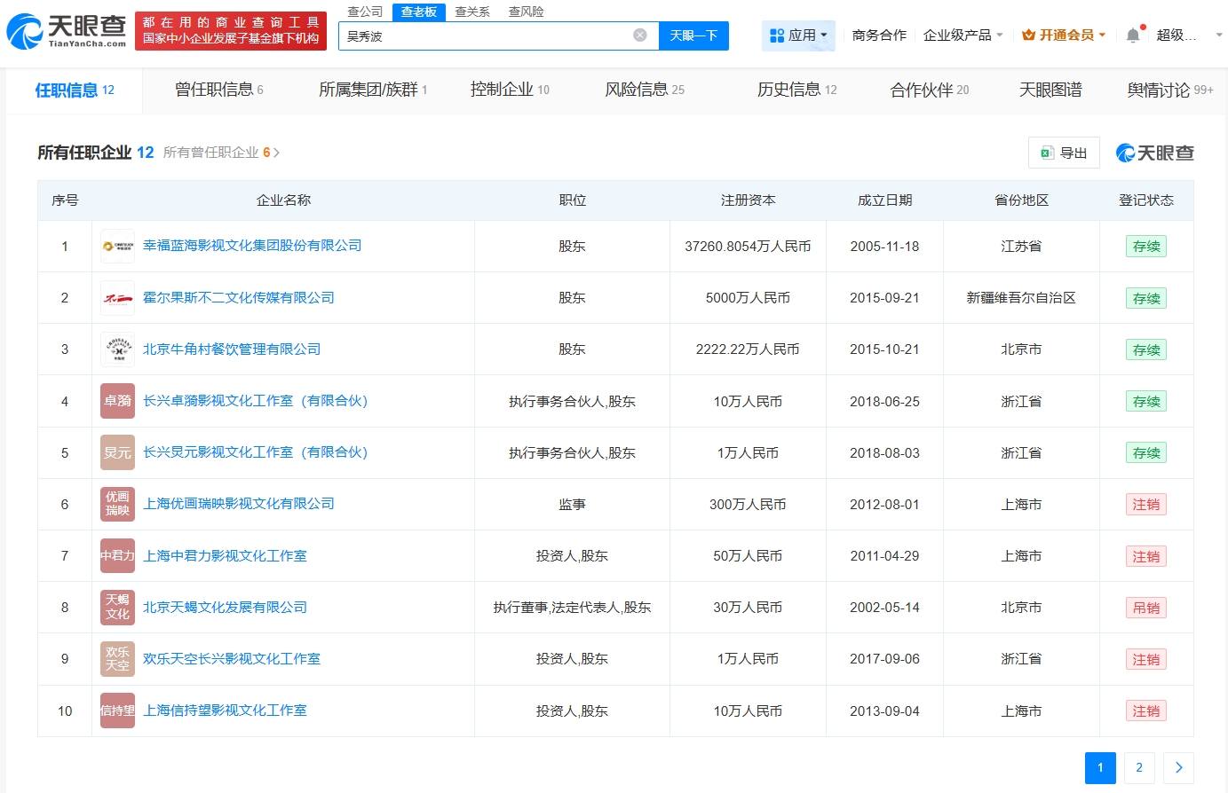 任职信息显示,目前,吴秀波名下关联12家企业,仅5家为存续状态,其余处于注销或被吊销状态。