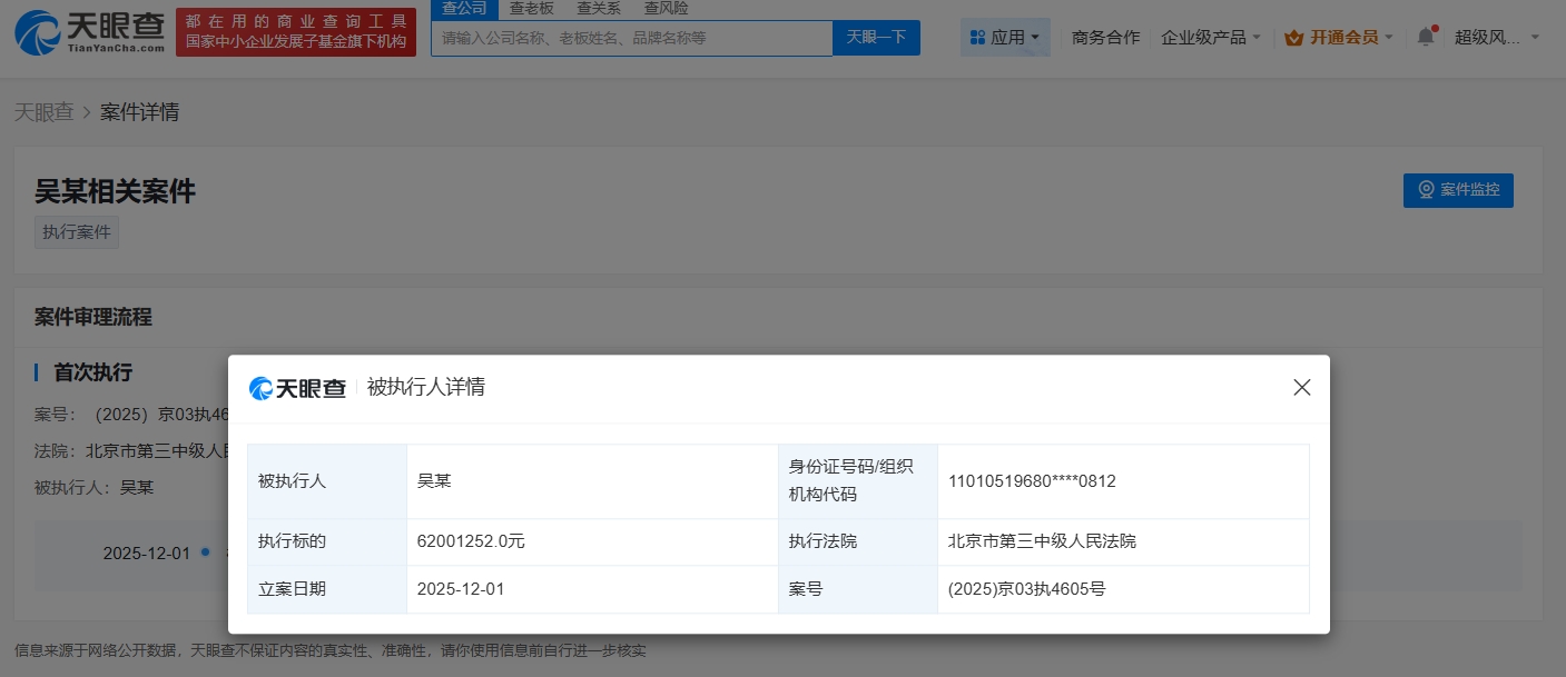 雷达财经讯,天眼查天眼风险信息显示,近日,吴秀波新增一则被执行人信息,执行标的6200万余元,执行法院为北京市第三中级人民法院。