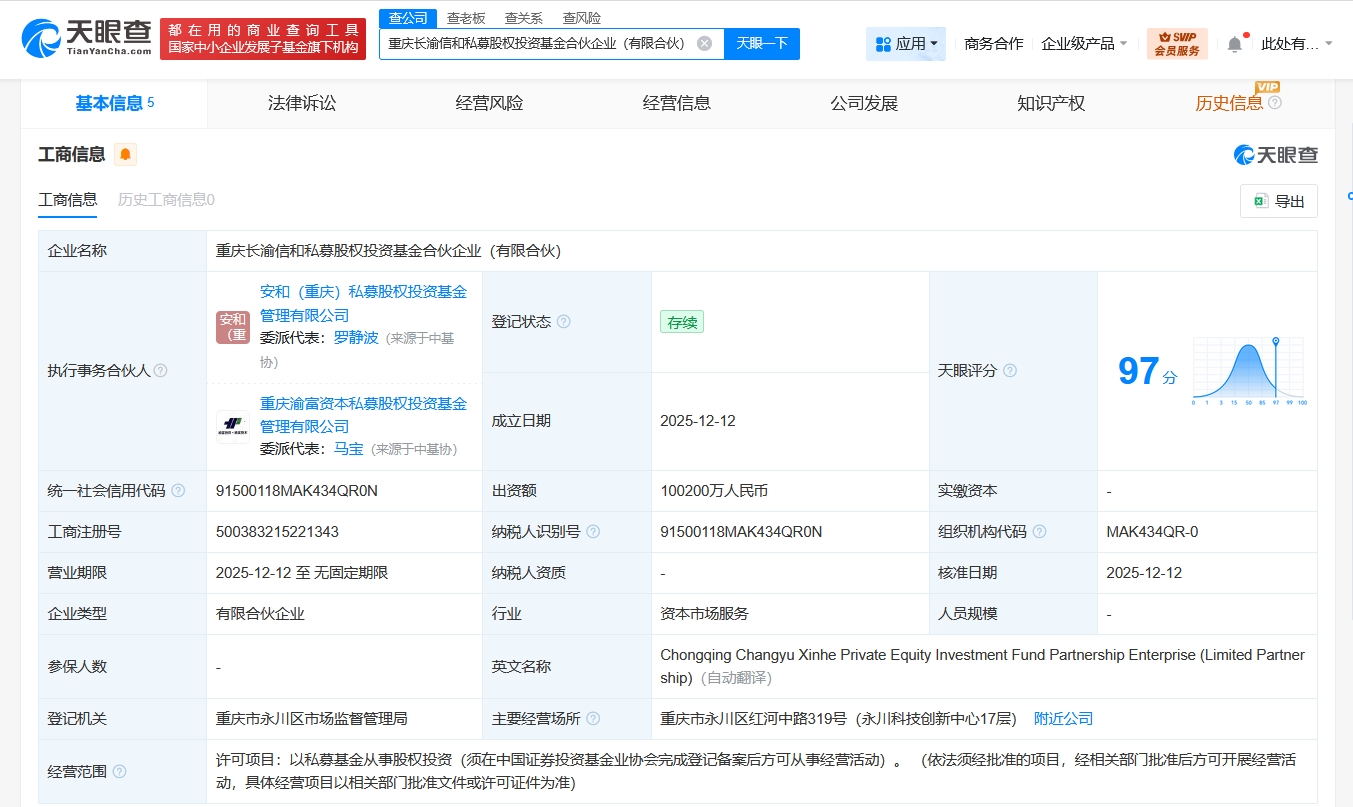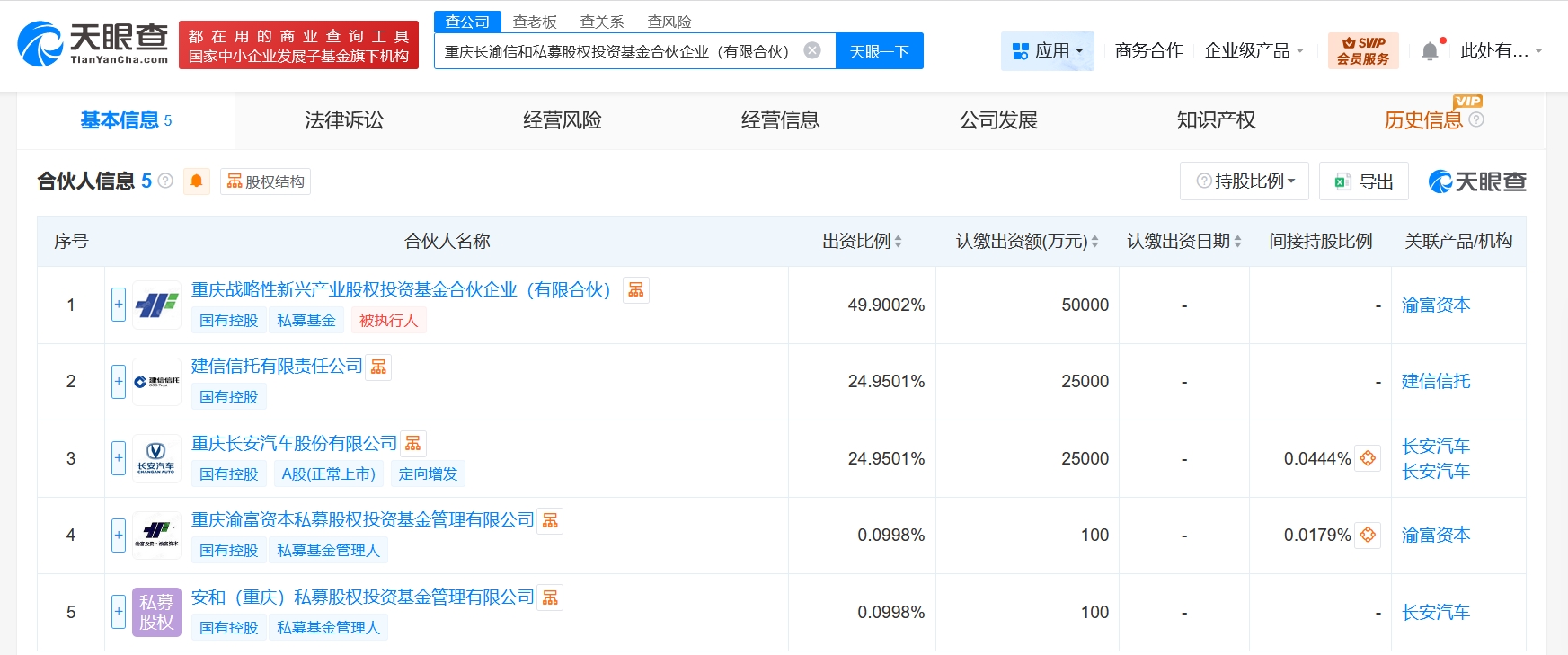 雷达财经讯,天眼查App显示,近日,重庆长渝信和私募股权投资基金合伙企业(有限合伙)成立,执行事务合伙人为安和(重庆)私募股权投资基金管理有限公司、重庆渝富资本私募股权投资基金管理有限公司,出资额10.02亿人民币,经营范围为以私募基金从事股权投资。合伙人信息显示,该基金由重庆战略性新兴产业股权投资基金合伙企业(有限合伙)、建信信托有限责任公司、长安汽车(000625)等共同出资。