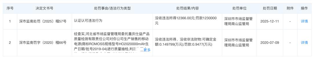 天眼查显示,因公司生产销售的移动电源(商标ROMOSS规格型号HO2020000mAh生产日期/批号2019-04)在质量抽检时被判定为不合格,2020年7月,罗马仕还曾被深圳市市场监督管理局南山监管局没收违法所得、没收非法财物:可确定金额约0.15万元,罚款约0.95万元。