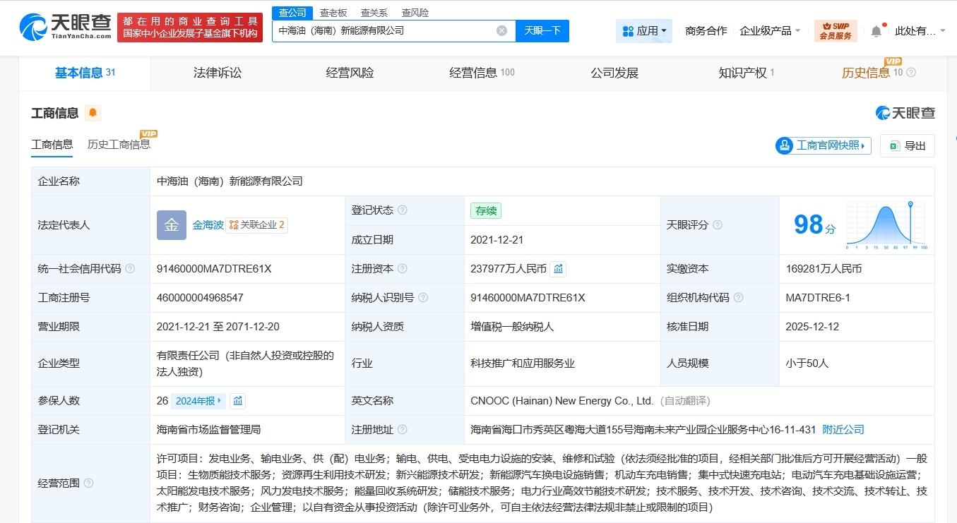 该公司成立于2021年12月,法定代表人为金海波,经营范围含发电业务、输电业务、供(配)电业务,输电、供电、受电电力设施的安装、维修和试验,生物质能技术服务,资源再生利用技术研发,新兴能源技术研发,新能源汽车换电设施销售等,由中海石油(中国)有限公司全资持股。
