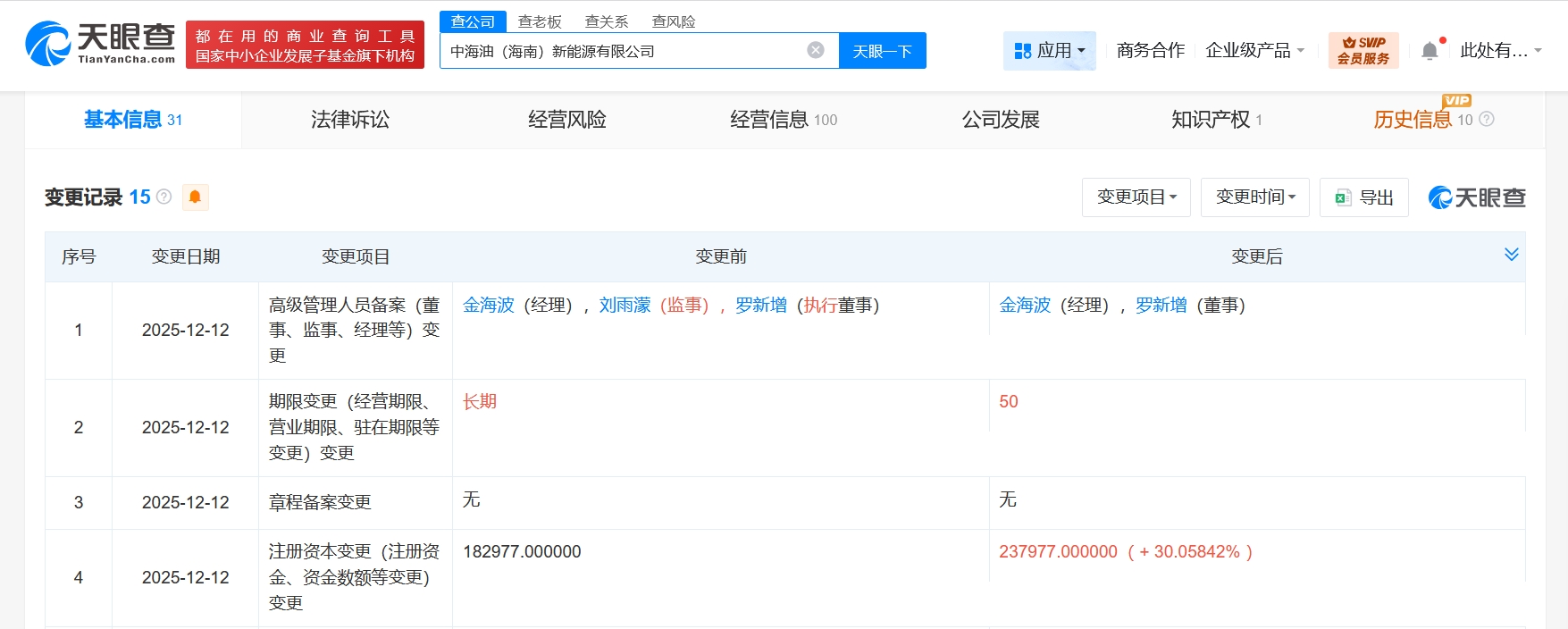 雷达财经讯,天眼查App显示,近日,中海油(海南)新能源有限公司发生工商变更,注册资本由约18.3亿人民币增至约23.8亿人民币,增幅约30%,同时,部分主要人员也发生变更。