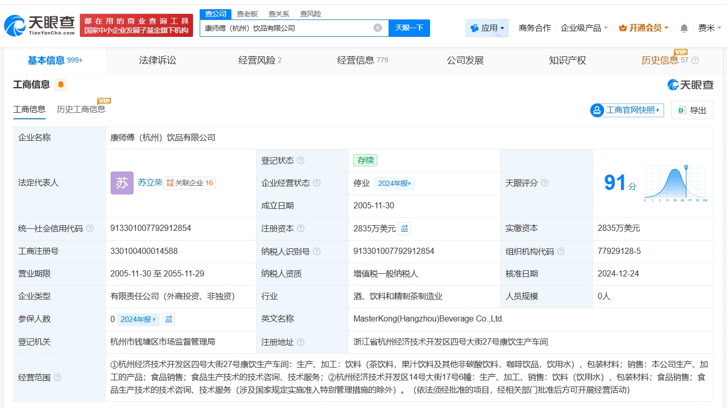 雷达财经讯,天眼查经营风险信息显示,近日,康师傅(杭州)饮品有限公司新增一则简易注销公告,公告期为12月8日至12月27日。