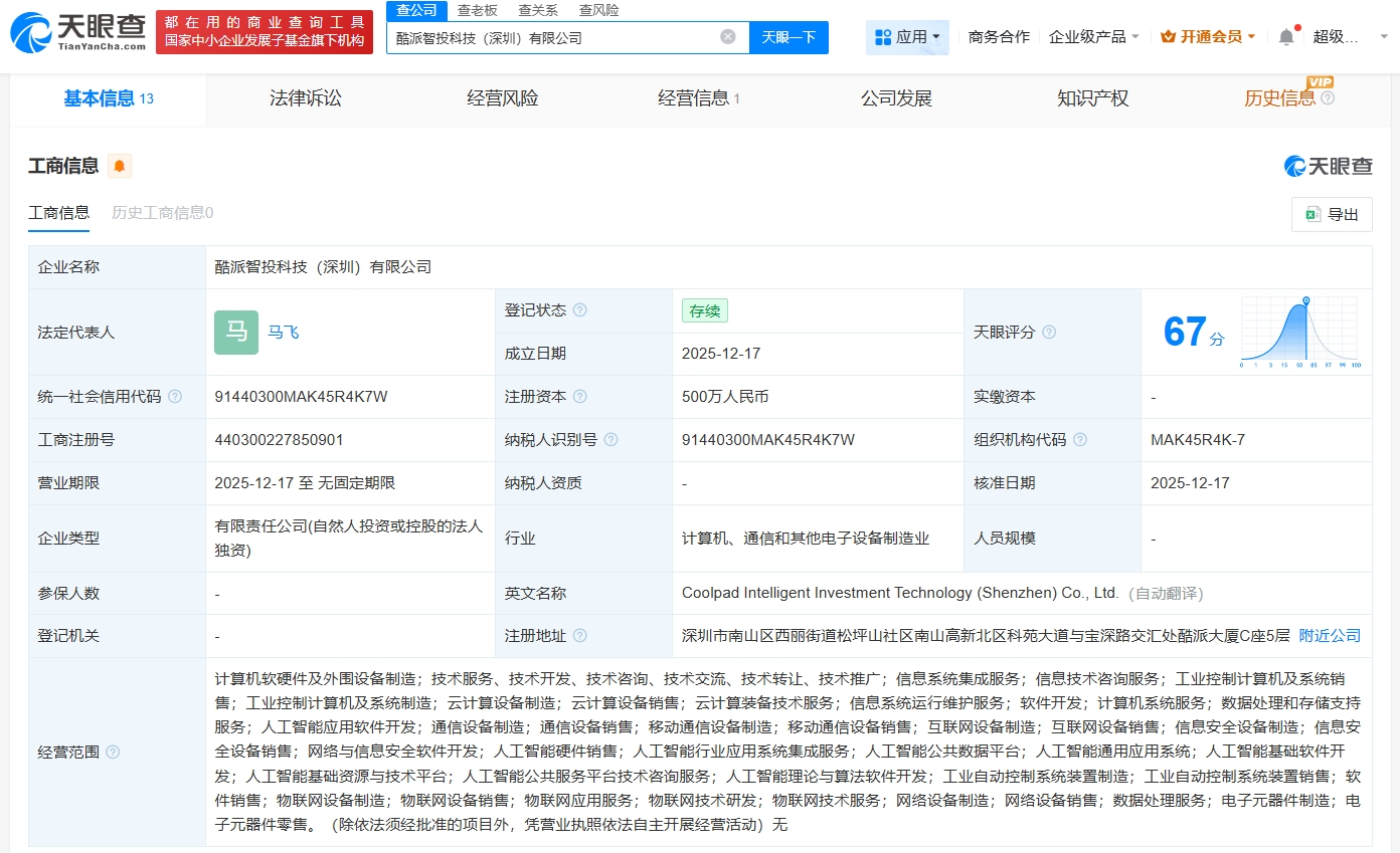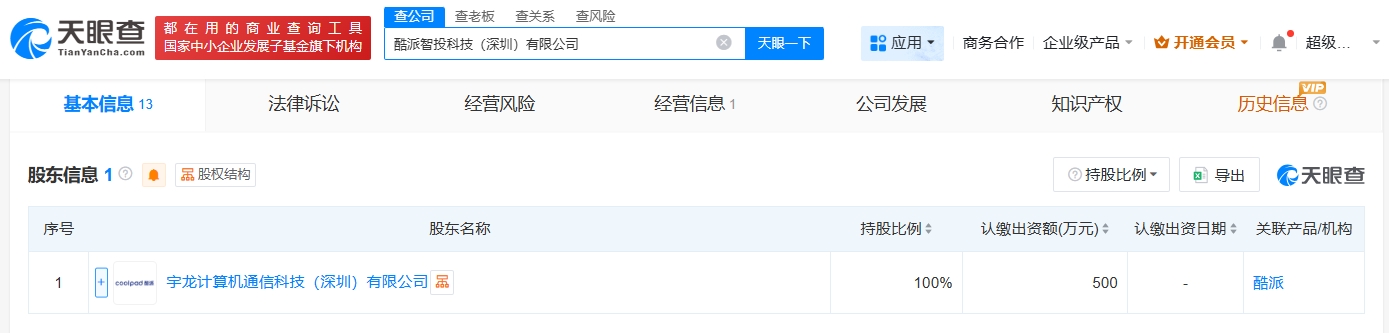 雷达财经讯,天眼查App显示,近日,酷派智投科技(深圳)有限公司成立,法定代表人为马飞,注册资本500万人民币,经营范围包括计算机软硬件及外围设备制造、人工智能应用软件开发、人工智能行业应用系统集成服务、人工智能公共数据平台等。股东信息显示,该公司由酷派关联公司宇龙计算机通信科技(深圳)有限公司全资持股。