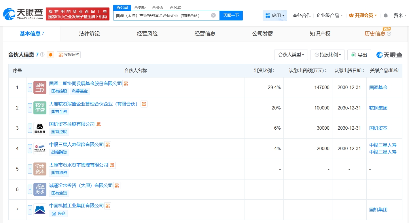 雷达财经讯,天眼查App显示,近日,国调(太原)产业投资基金合伙企业(有限合伙)成立,执行事务合伙人为诚通汾水投资(太原)有限公司,出资额50亿人民币,经营范围为以私募基金从事股权投资、投资管理、资产管理等活动,由国调二期协同发展基金股份有限公司、鞍钢集团旗下大连鞍资滨盛企业管理合伙企业(有限合伙)、国机资本控股有限公司等共同出资。