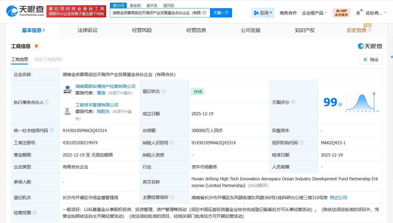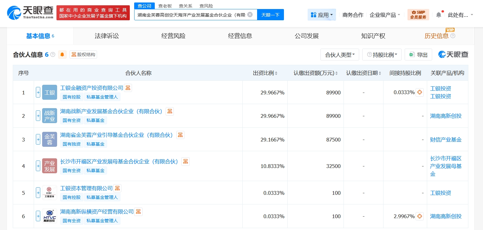 雷达财经讯,天眼查App显示,近日,湖南金芙蓉高创空天海洋产业发展基金合伙企业(有限合伙)成立,执行事务合伙人为湖南高新纵横资产经营有限公司、工银资本管理有限公司,出资额30亿人民币,经营范围为以私募基金从事股权投资、投资管理、资产管理等活动。合伙人信息显示,该基金由工银金融资产投资有限公司、湖南战新产业发展基金合伙企业(有限合伙)、湖南省金芙蓉产业引导基金合伙企业(有限合伙)等共同出资。