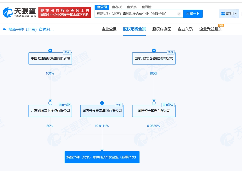 雷达财经讯,天眼查App显示,近日,焕新兴种(北京)育种科技合伙企业(有限合伙)成立,执行事务合伙人为国投资产管理有限公司,出资额11.25亿人民币,经营范围包括技术服务、技术开发、技术咨询等,由中国诚通旗下北京诚通资本投资有限公司、国家开发投资集团有限公司及旗下国投资产管理有限公司共同出资。