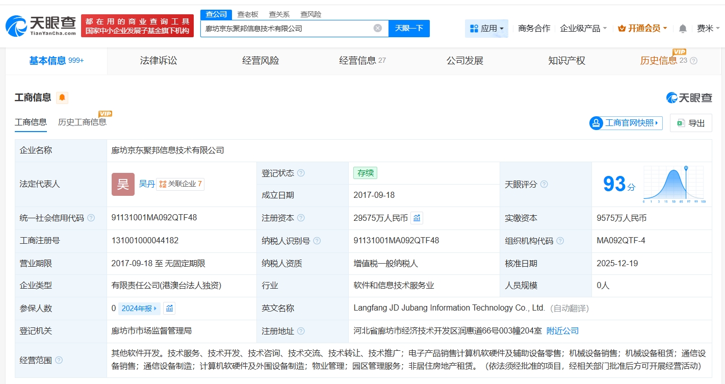 雷达财经讯,天眼查App显示,近日,廊坊京东聚邦信息技术有限公司发生工商变更,注册资本由9575万人民币增至约2.96亿人民币,增幅约209%,同时,辛波卸任法定代表人、执行董事兼总经理,吴丹接任法定代表人、总经理并担任董事。