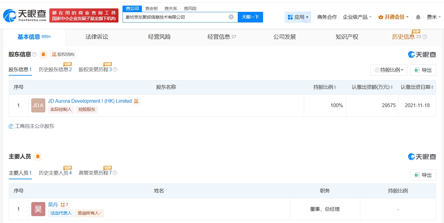 该公司成立于2017年9月,经营范围包括电子产品销售计算机软硬件及辅助设备零售、机械设备销售、机械设备租赁等,由JD Aurora Development I(HK)Limited全资持股。
