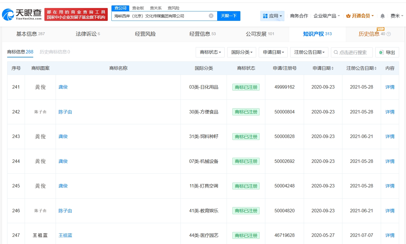 天眼查知识产权信息显示,上海丝芭演艺管理有限公司已注册多枚“李艺彤”商标,国际分类涉及医疗园艺、教育娱乐等,当前商标状态均为已注册。