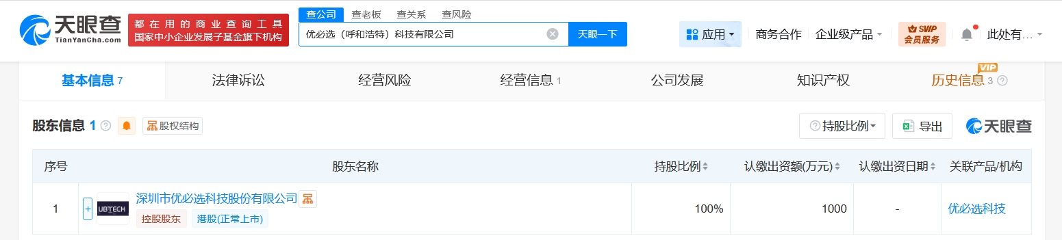 雷达财经讯,天眼查App显示,近日,优必选(呼和浩特)科技有限公司成立,法定代表人为刘继然,注册资本1000万人民币,经营范围含工业机器人制造、智能机器人销售、服务消费机器人制造、智能机器人的研发、信息技术咨询服务、人工智能理论与算法软件开发、人工智能行业应用系统集成服务、人工智能应用软件开发、通信设备制造等,由优必选(09880.HK)全资持股。