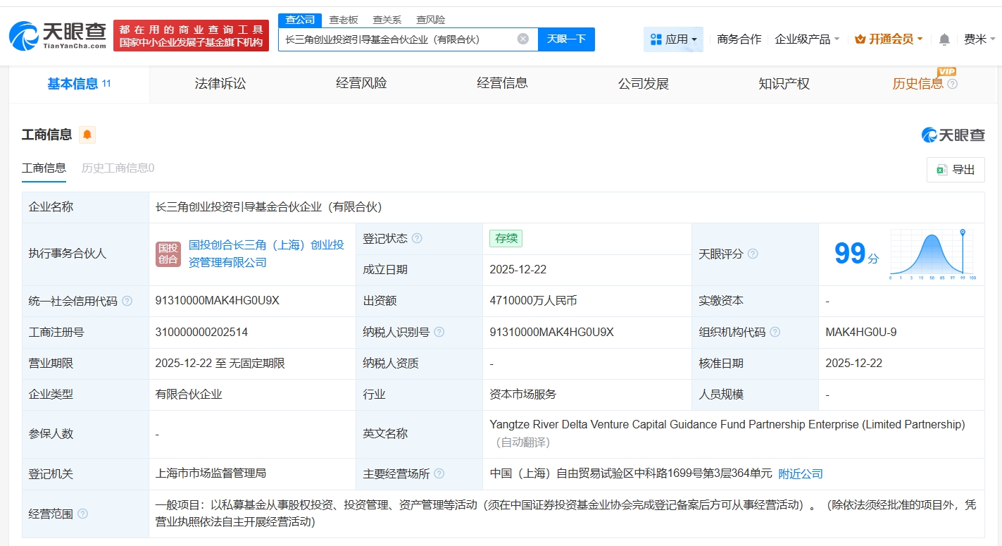 雷达财经讯,天眼查App显示,近日,长三角创业投资引导基金合伙企业(有限合伙)成立,执行事务合伙人为国投创合长三角(上海)创业投资管理有限公司,出资额471亿人民币,经营范围为以私募基金从事股权投资、投资管理、资产管理等活动,由安徽海螺集团有限责任公司、国家创业投资引导基金有限公司、国家开发投资集团有限公司等共同出资。