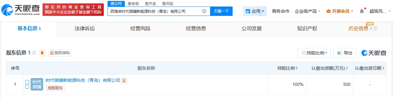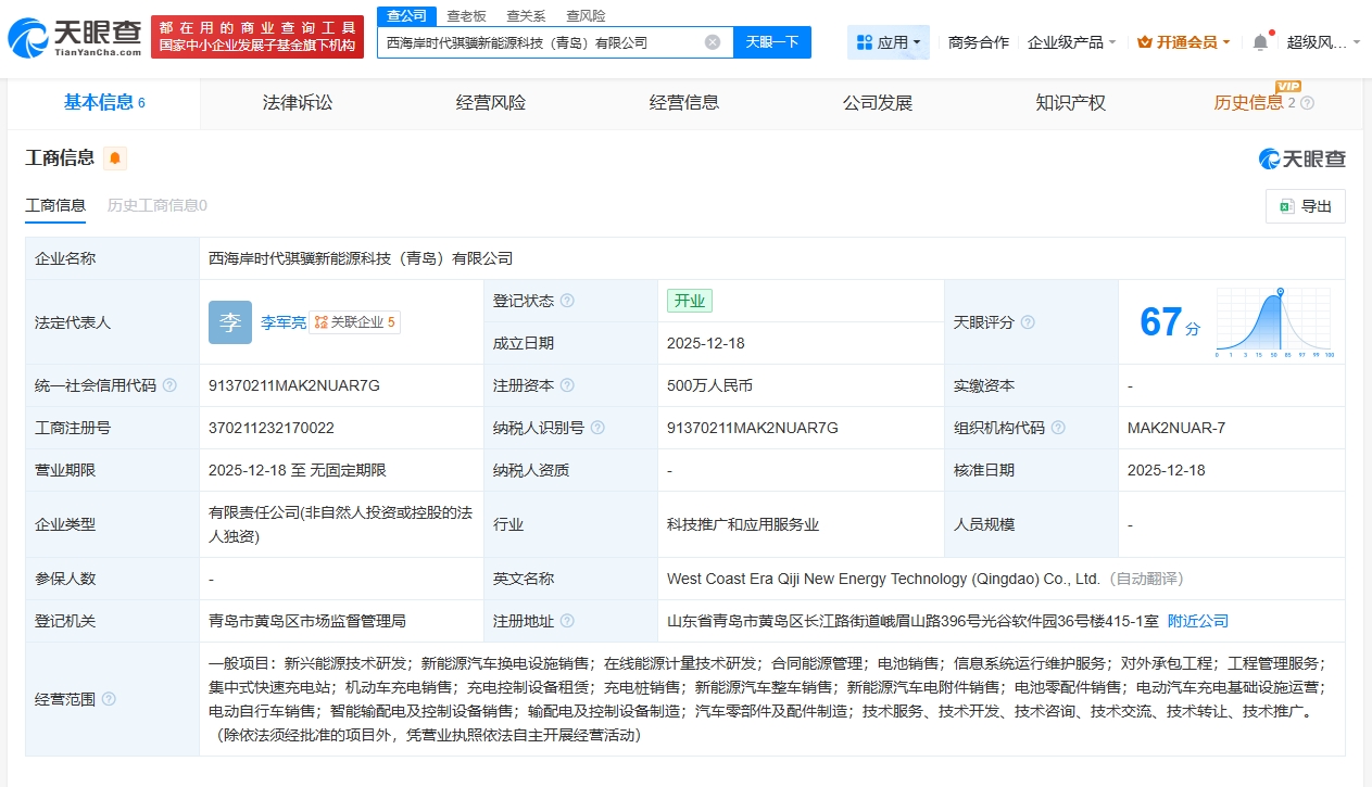 雷达财经讯,天眼查工商信息显示,近日,西海岸时代骐骥新能源科技(青岛)有限公司成立,法定代表人为李军亮,注册资本500万人民币,经营范围包括新兴能源技术研发、新能源汽车换电设施销售、在线能源计量技术研发、新能源汽车整车销售等。股东信息显示,该公司由宁德时代旗下时代骐骥新能源科技(青岛)有限公司全资持股。