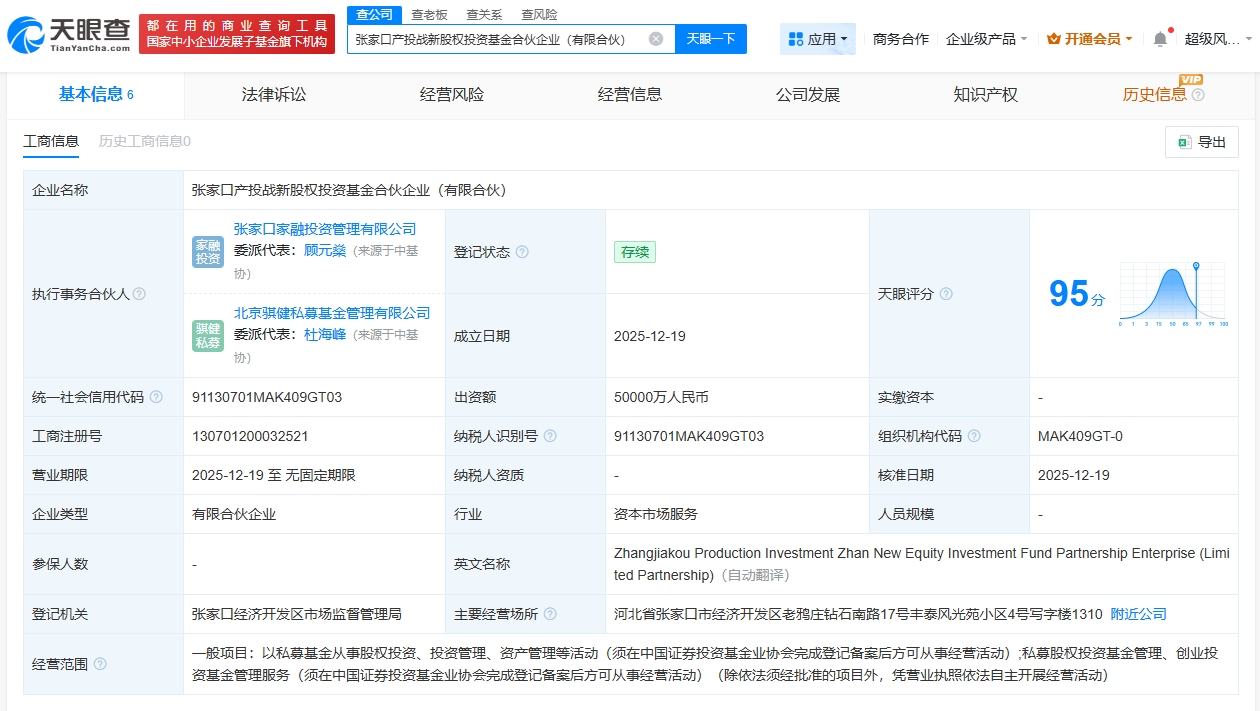 雷达财经讯,天眼查工商信息显示,近日,张家口产投战新股权投资基金合伙企业(有限合伙)成立,执行事务合伙人为张家口家融投资管理有限公司、北京骐健私募基金管理有限公司,出资额5亿人民币,经营范围包括私募股权投资基金管理、创业投资基金管理服务等。合伙人信息显示,该基金由张家口聚鑫股权投资基金合伙企业(有限合伙)、河北产业投资引导基金有限公司等共同出资。