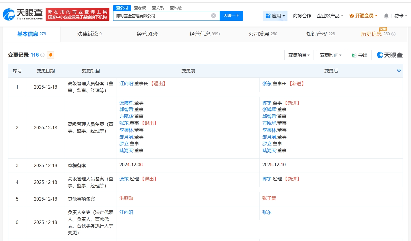 雷达财经讯,天眼查App显示,近日,博时基金管理有限公司发生工商变更,江向阳卸任董事长、法定代表人,由张东接任,同时,张东卸任董事、经理职务,由陈宇接任。