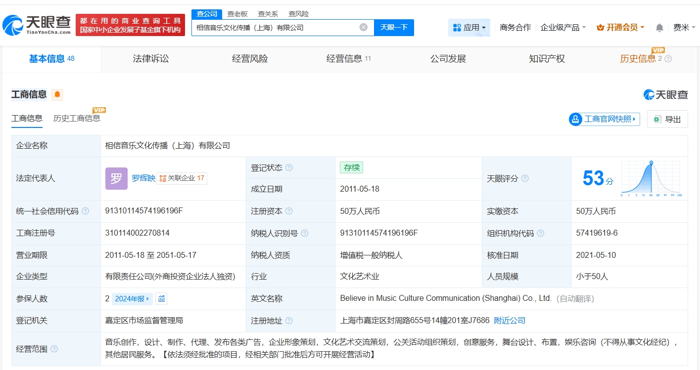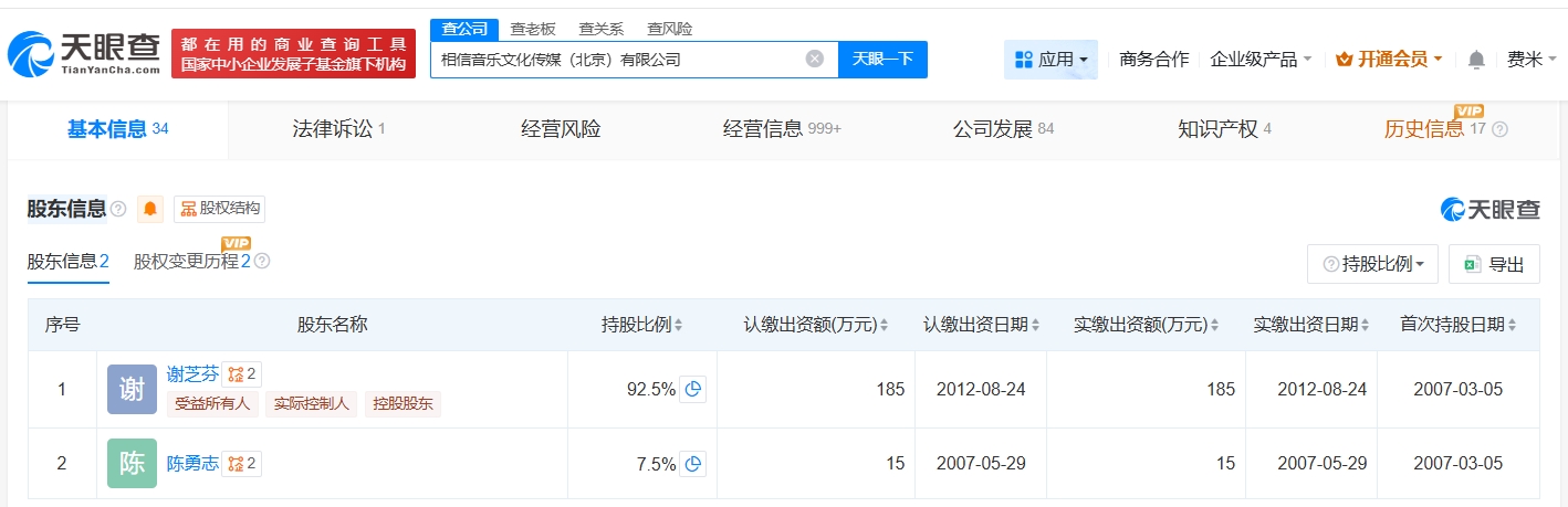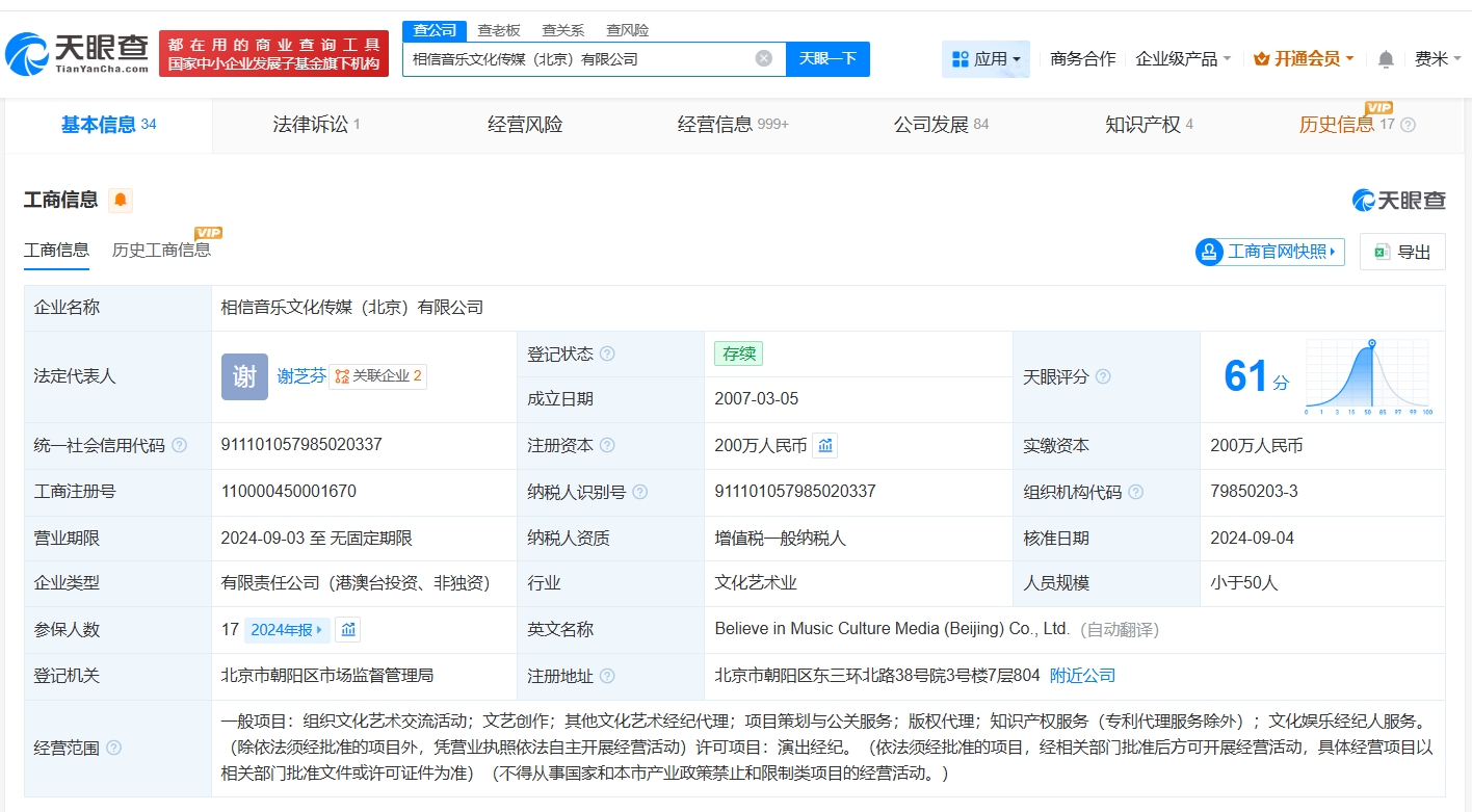 天眼查App显示,相信音乐文化传媒(北京)有限公司成立于2007年3月,法定代表人为谢芝芬,注册资本200万人民币,经营范围包括组织文化艺术交流活动、文艺创作、其他文化艺术经纪代理等,由谢芝芬、陈勇志共同持股。对外投资信息显示,该公司全资持股相信音乐文化传播(上海)有限公司,后者成立于2011年5月,法定代表人为罗辉映,注册资本50万人民币,经营范围包括企业形象策划、文化艺术交流策划、公关活动组织策划等。