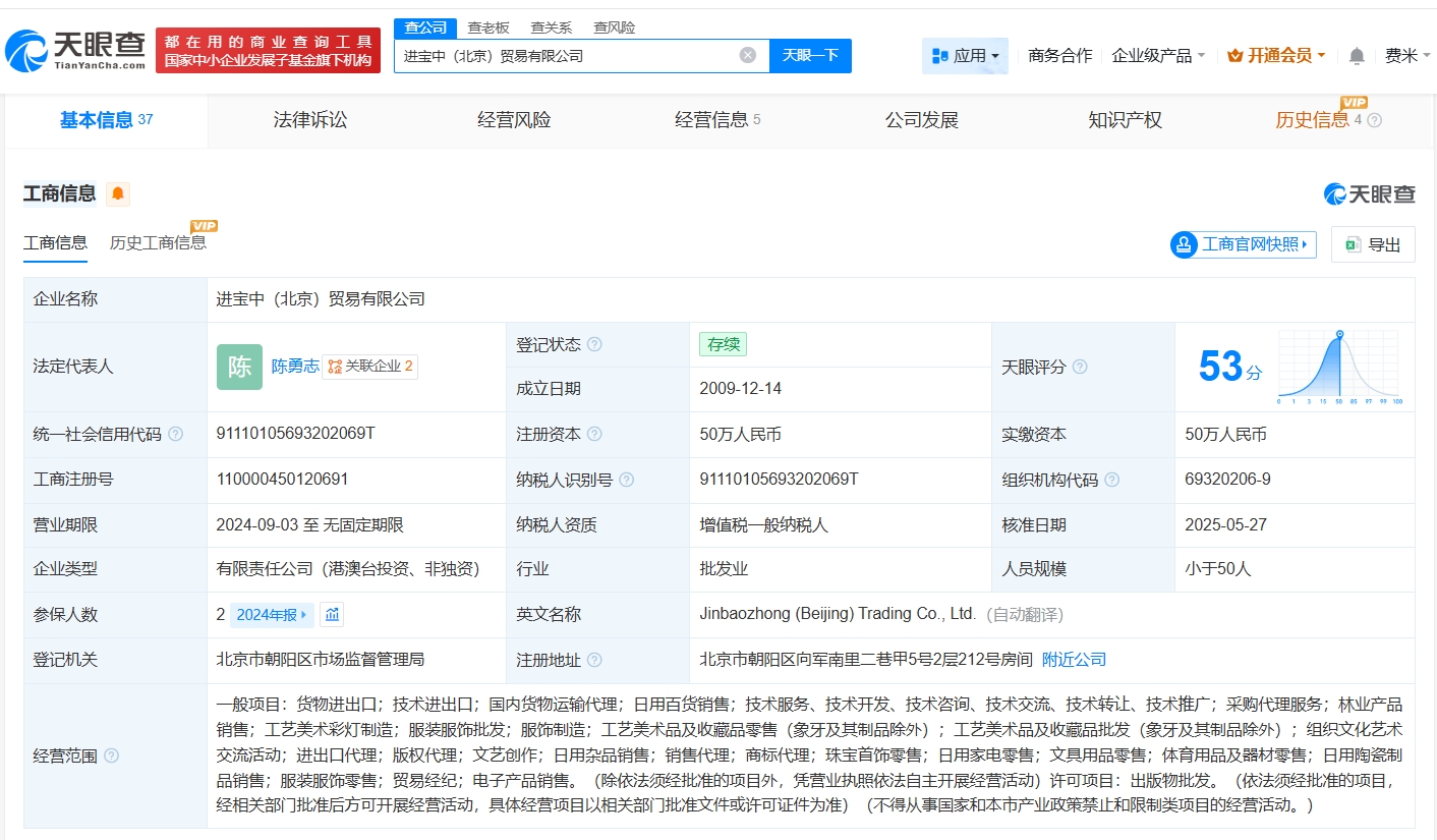 值得一提的是,谢芝芬名下还关联进宝中(北京)贸易有限公司,该公司成立于2009年12月,法定代表人为陈勇志,注册资本50万人民币,经营范围包括货物进出口、技术进出口、国内货物运输代理等,由谢芝芬、陈勇志共同持股。