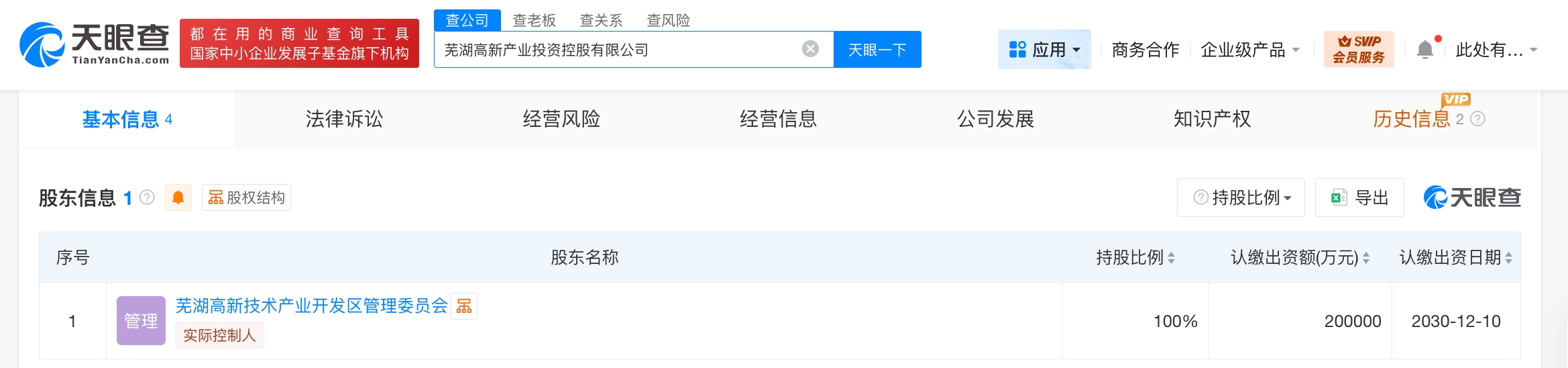 雷达财经讯,天眼查工商信息显示,近日,芜湖高新产业投资控股有限公司成立,法定代表人为鲍凡,注册资本20亿人民币,经营范围为以自有资金从事投资活动、企业管理、咨询策划服务、非融资担保服务、园区管理服务、自有资金投资的资产管理服务。股东信息显示,该公司由芜湖高新技术产业开发区管理委员会全资持股。