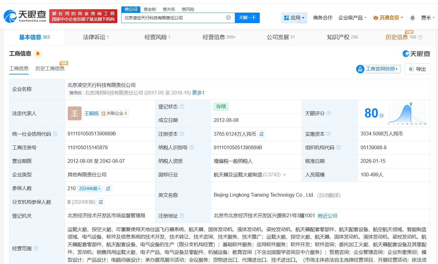 北京凌空天行科技有限责任公司成立于2012年8月,法定代表人为王毓栋,经营范围包括销售民用运载火箭、电子产品、电气设备及零配件、机械设备等。股东信息显示,该公司现由王毓栋、刘波及上述新增股东等共同持股。据媒体报道,此前,该公司因造出高超音速导弹引发关注。
