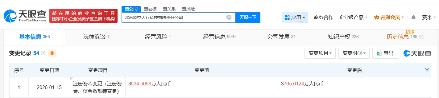 雷达财经讯,天眼查工商信息显示,近日,北京凌空天行科技有限责任公司发生工商变更,新增北京市商业航天和低空经济产业投资基金(有限合伙)、嘉兴沃赋凌空股权投资合伙企业(有限合伙)、北京市新材料产业投资基金(有限合伙)等为股东,同时,注册资本由约3535万人民币增至约3766万人民币,同时,多位主要人员发生变更。