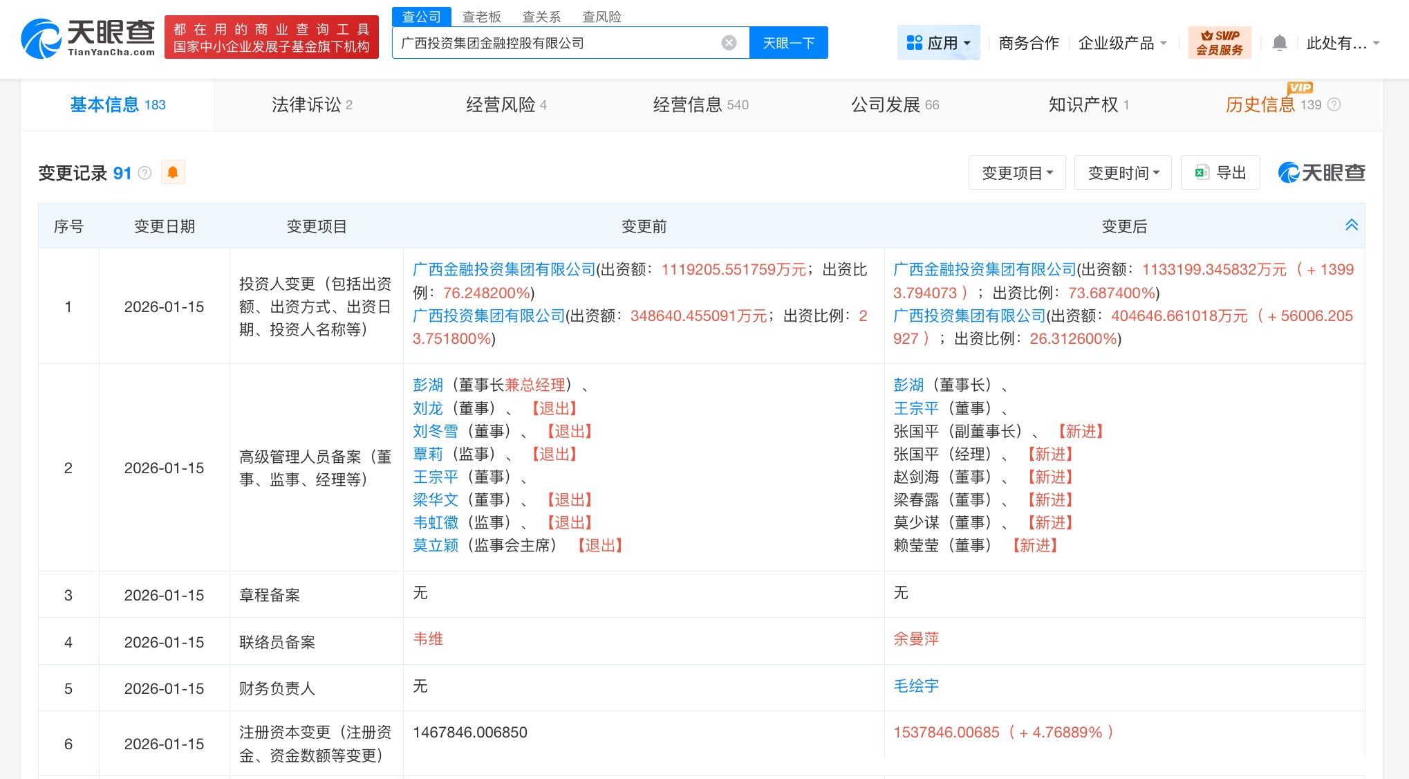 雷达财经讯,天眼查工商信息显示,近日,广西投资集团金融控股有限公司发生工商变更,注册资本由约146.8亿人民币增至约153.8亿人民币,增幅约5%,同时,多位高管发生变更。
