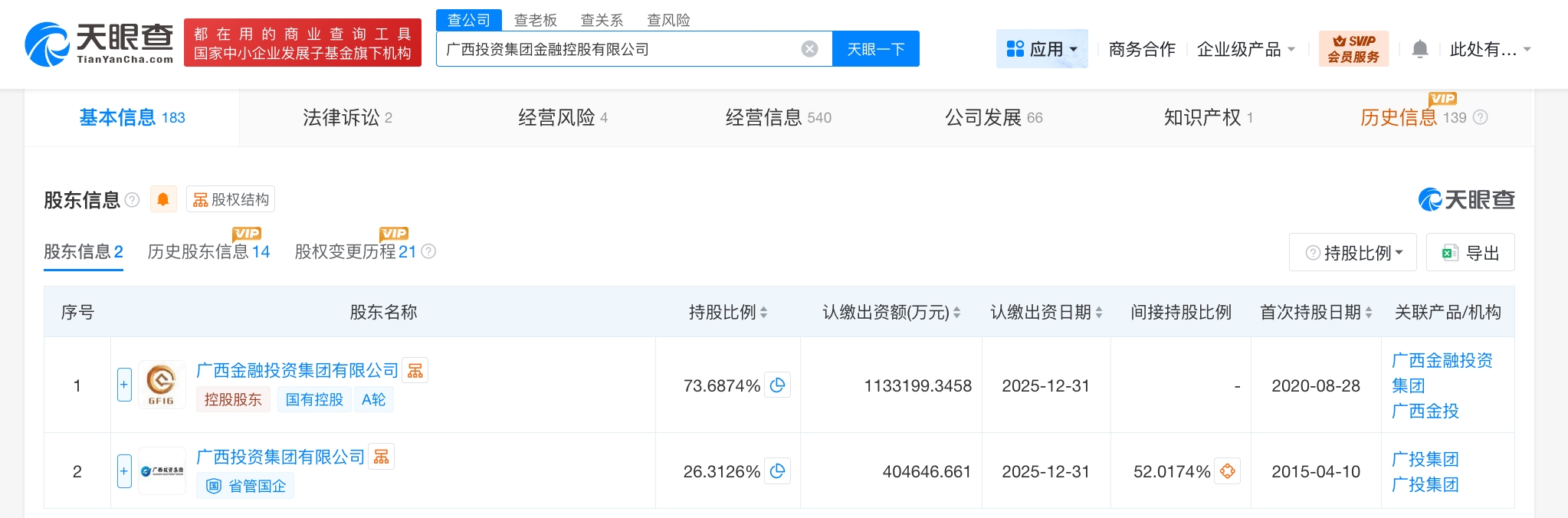 该公司成立于2003年4月,法定代表人为彭湖,经营范围为对银行、证券、保险的投资管理,投融资及金融研究,企业自有资金投资,股权投资及管理,资产管理及处置,受托资产管理,投资及管理咨询服务。股东信息显示,该公司由广西金融投资集团有限公司、广西投资集团有限公司共同持股。
