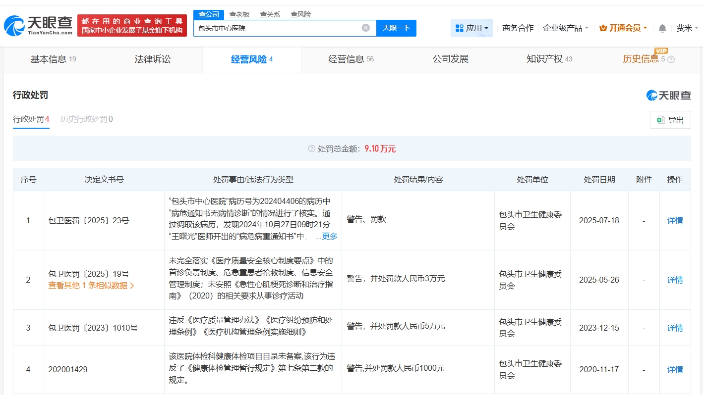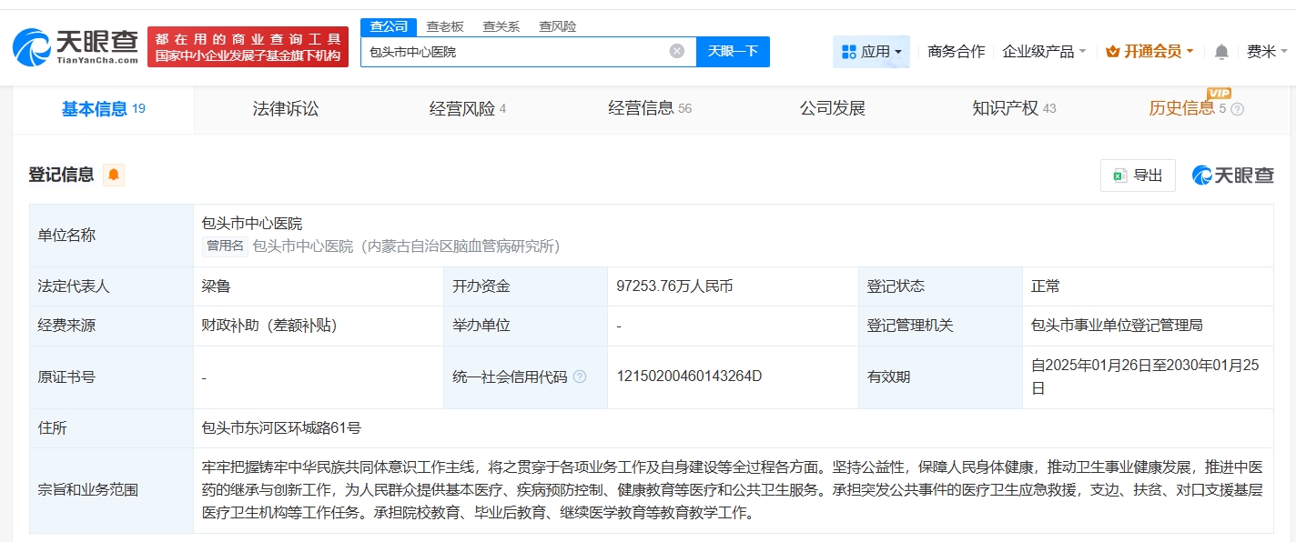 天眼查工商信息显示,涉事医院包头市中心医院法定代表人为梁鲁,开办资金约9.7亿人民币,宗旨和业务范围包括承担突发公共事件的医疗卫生应急救援等。天眼风险信息显示,该医院现存多条行政处罚信息。