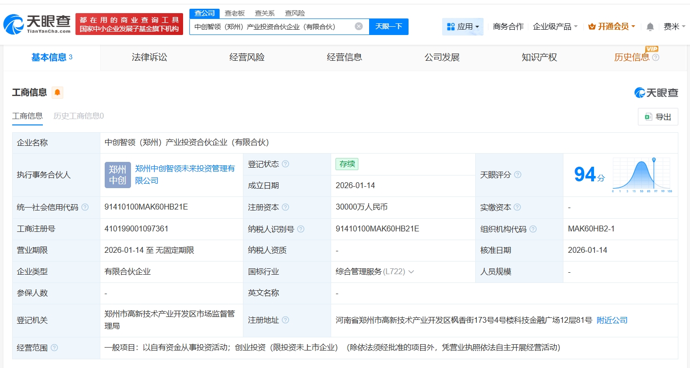 雷达财经讯,天眼查工商信息显示,近日,中创智领(郑州)产业投资合伙企业(有限合伙)成立,执行事务合伙人为郑州中创智领未来投资管理有限公司,出资额3亿人民币,经营范围为以自有资金从事投资活动、创业投资。合伙人信息显示,该合伙企业由中创智领(601717)及旗下郑州中创智领未来投资管理有限公司共同出资。