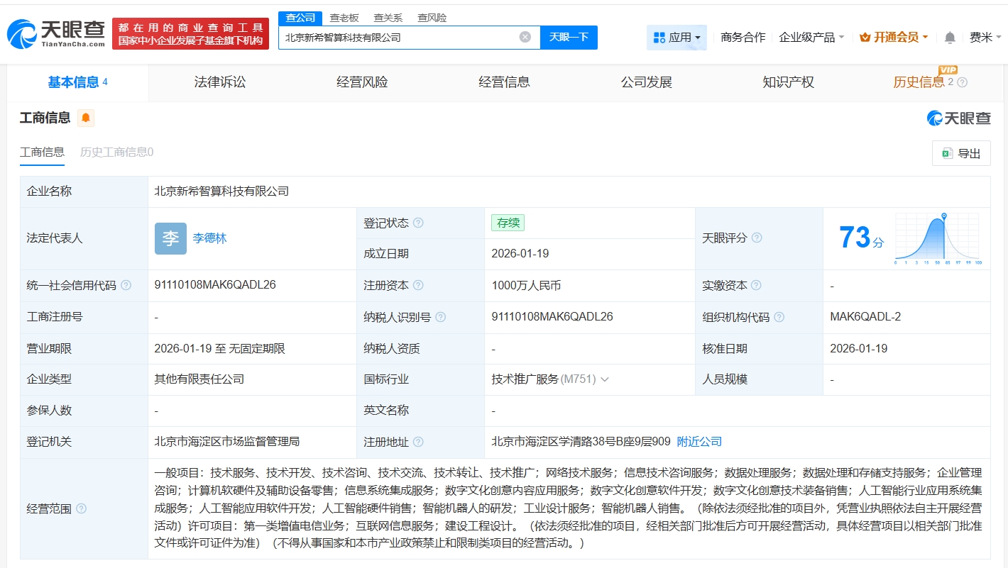 雷达财经讯,天眼查工商信息显示,近日,北京新希智算科技有限公司成立,法定代表人为李德林,注册资本1000万人民币,经营范围包括人工智能行业应用系统集成服务、人工智能应用软件开发、人工智能硬件销售等。股权全景穿透图显示,该公司由中公教育(002607)旗下北京中公致远科技有限公司、深圳市芯核云启数字科技有限公司共同持股。