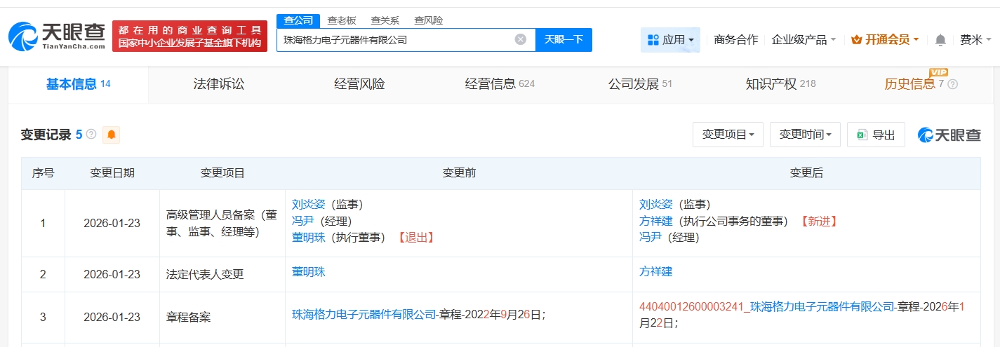 雷达财经讯,天眼查工商信息显示,近日,珠海格力电子元器件有限公司发生工商变更,董明珠卸任法定代表人、执行董事,方祥建接任法定代表人并担任执行公司事务的董事。