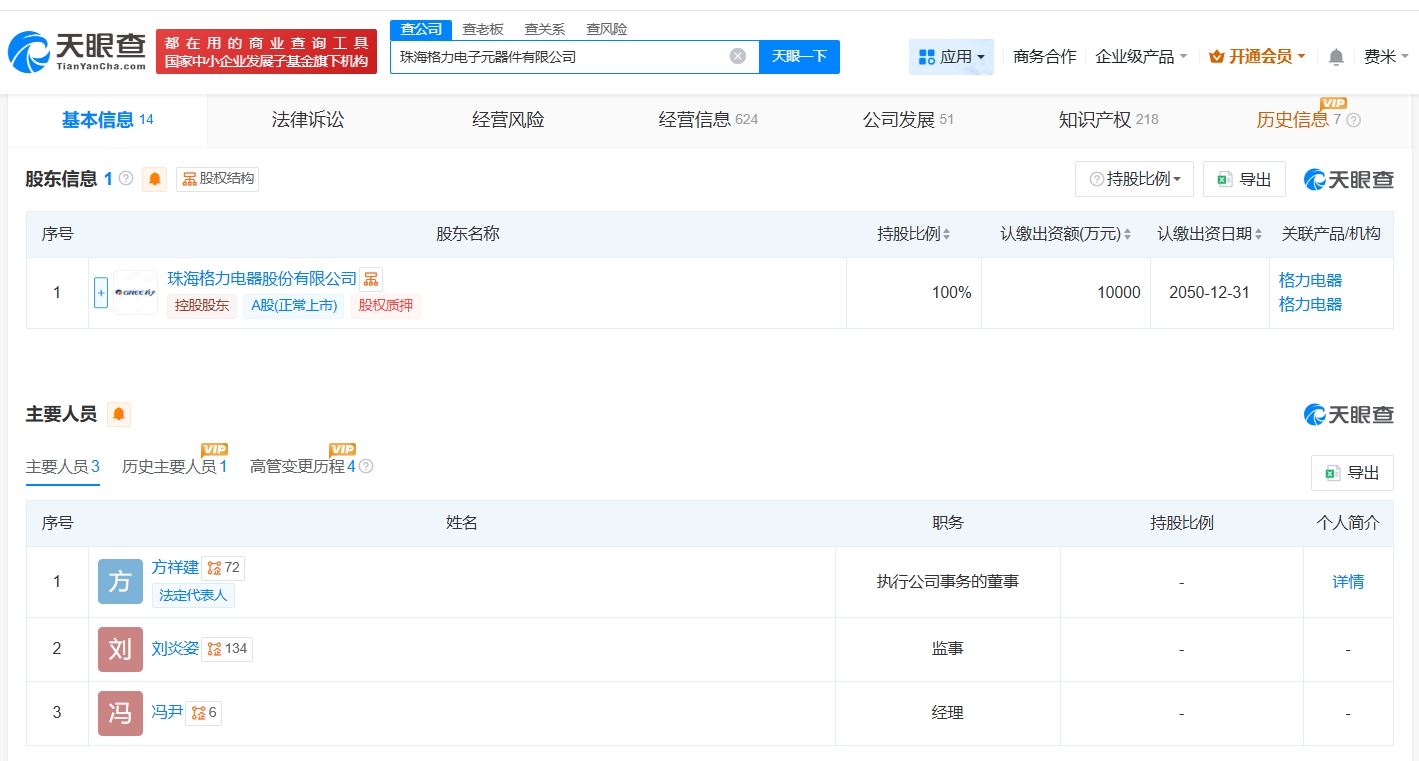 珠海格力电子元器件有限公司成立于2022年7月,注册资本1亿人民币,经营范围包括电子元器件制造、电子元器件批发、电力电子元器件制造等。股东信息显示,该公司由格力电器(000651)全资持股。