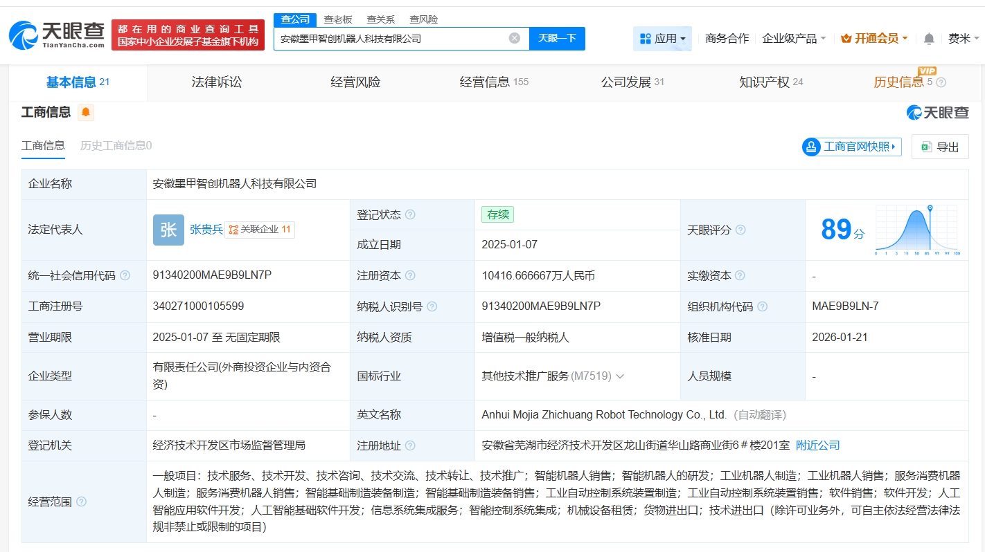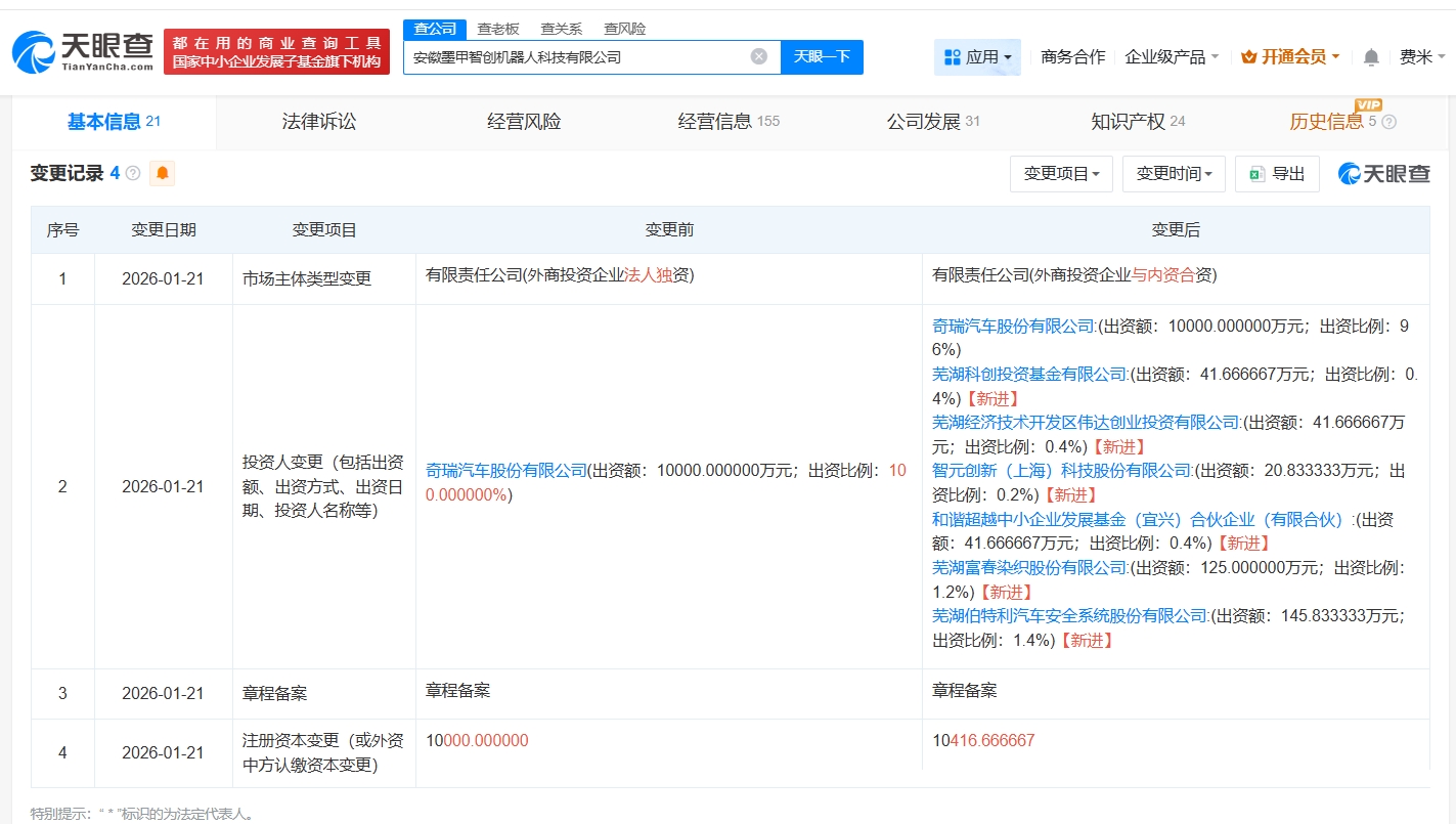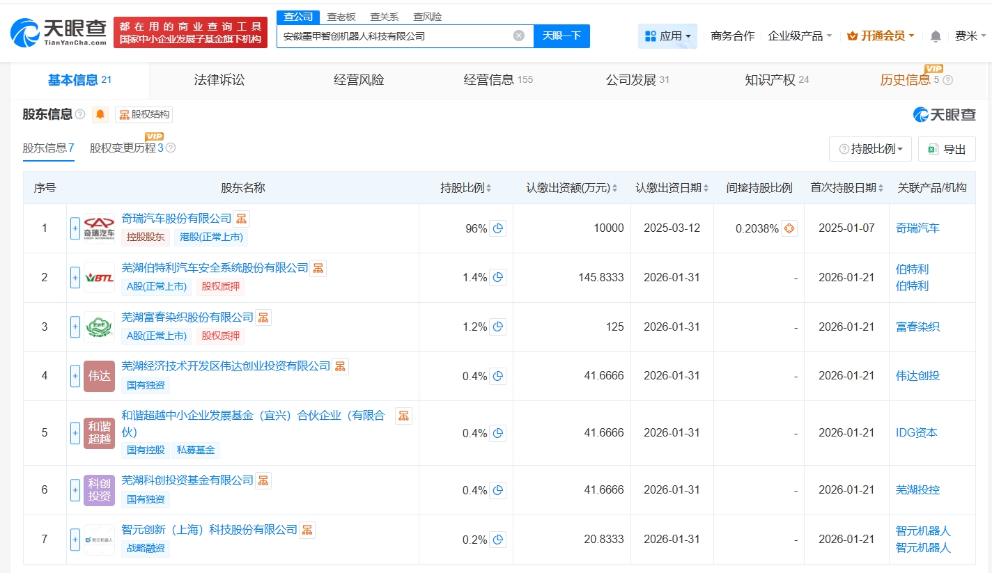 安徽墨甲智创机器人科技有限公司成立于2025年1月,法定代表人为张贵兵,经营范围包括智能机器人销售、智能机器人的研发、工业机器人制造等。股东信息显示,该公司由奇瑞汽车(09973.HK)及上述新增股东共同持股。