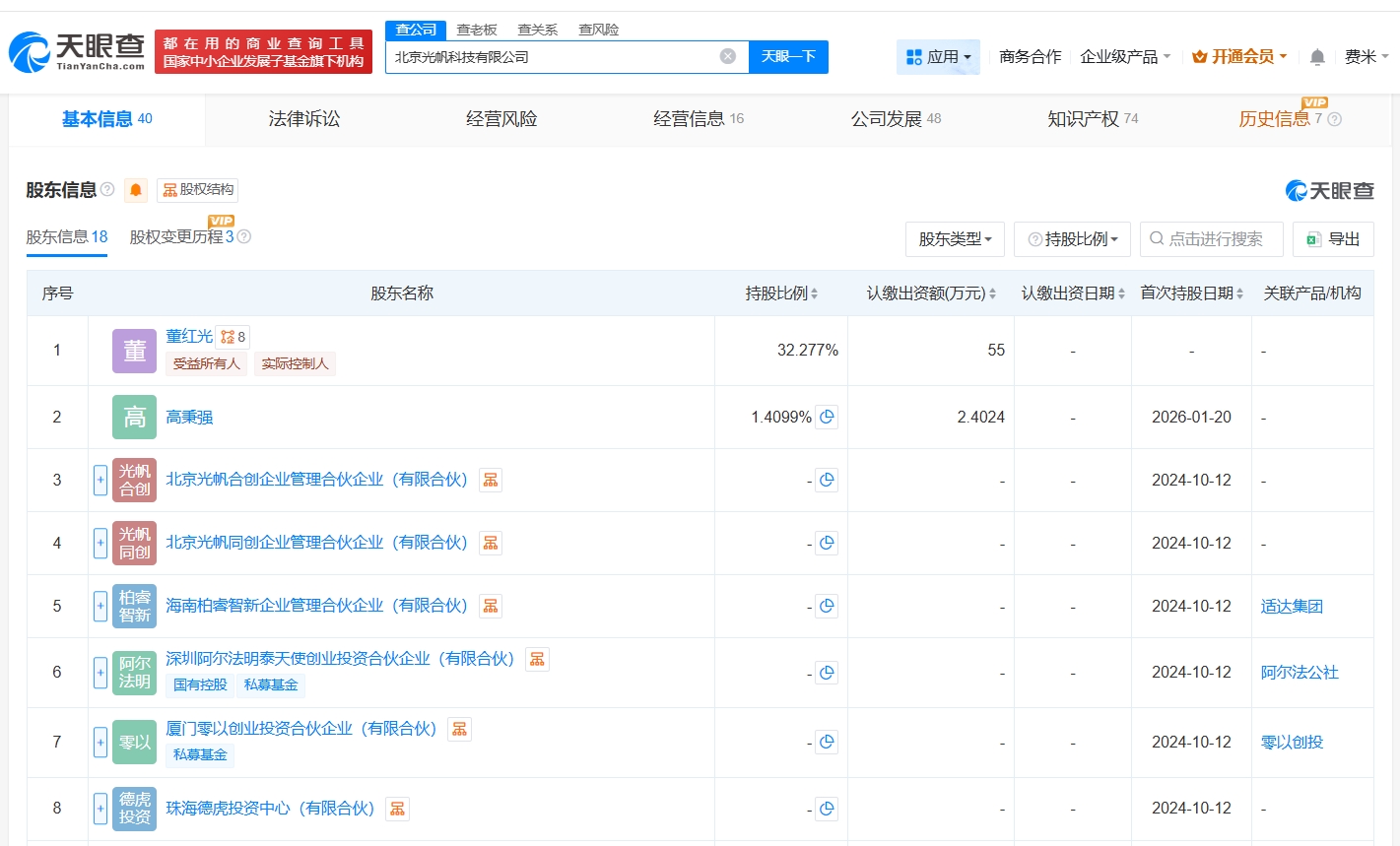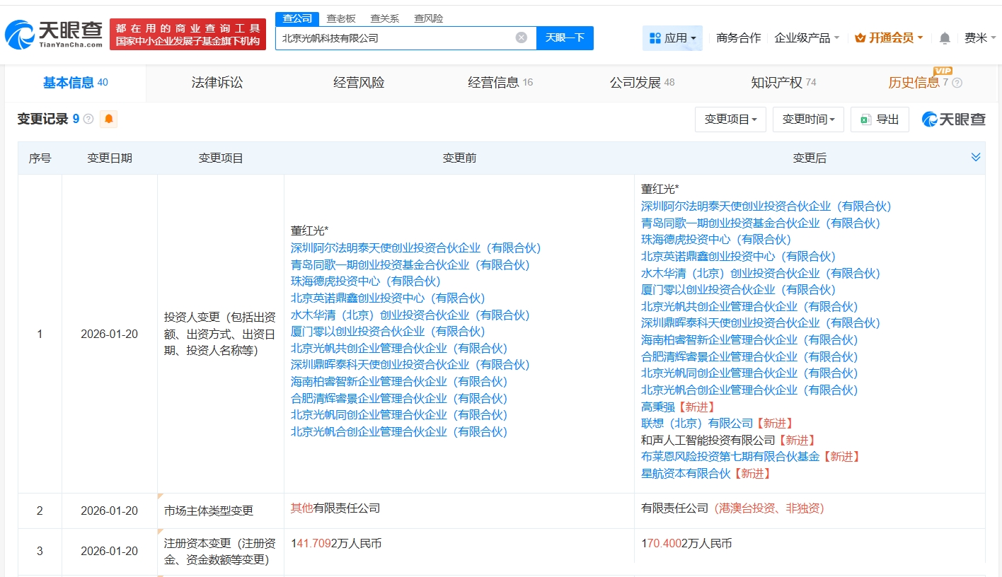 北京光帆科技有限公司成立于2024年10月,法定代表人为董红光,经营范围包括可穿戴智能设备制造、智能机器人销售、人工智能硬件销售等,现由董红光、深圳阿尔法明泰天使创业投资合伙企业(有限合伙)及上述新增股东等共同持股。公开资料显示,该公司致力于构建面向下一代人机交互的AI可穿戴硬件及通用AI Agent。
