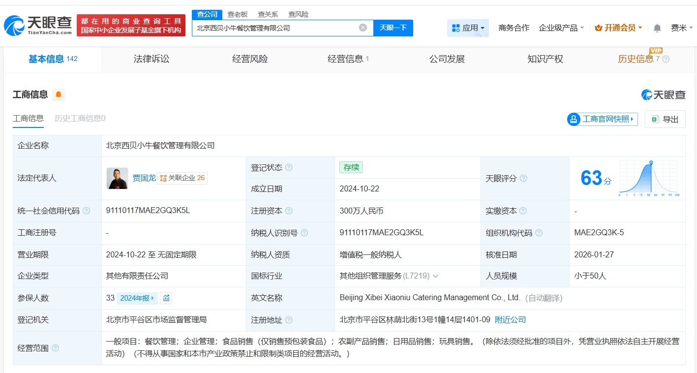 该公司成立于2024年10月,注册资本300万人民币,经营范围包括餐饮管理、企业管理、食品销售等,由内蒙古西贝餐饮集团有限公司、内蒙古贾国龙功夫菜食品销售有限公司共同持股。