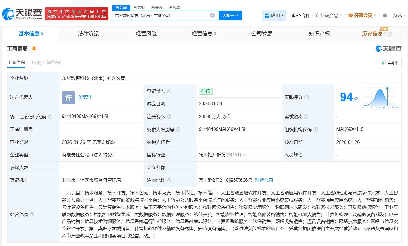 雷达财经讯,天眼查App显示,近日,东华数智科技(北京)有限公司成立,法定代表人为许笕昌,注册资本3亿人民币,经营范围包括人工智能基础软件开发、人工智能应用软件开发、人工智能理论与算法软件开发等,由东华软件(002065)全资持股。