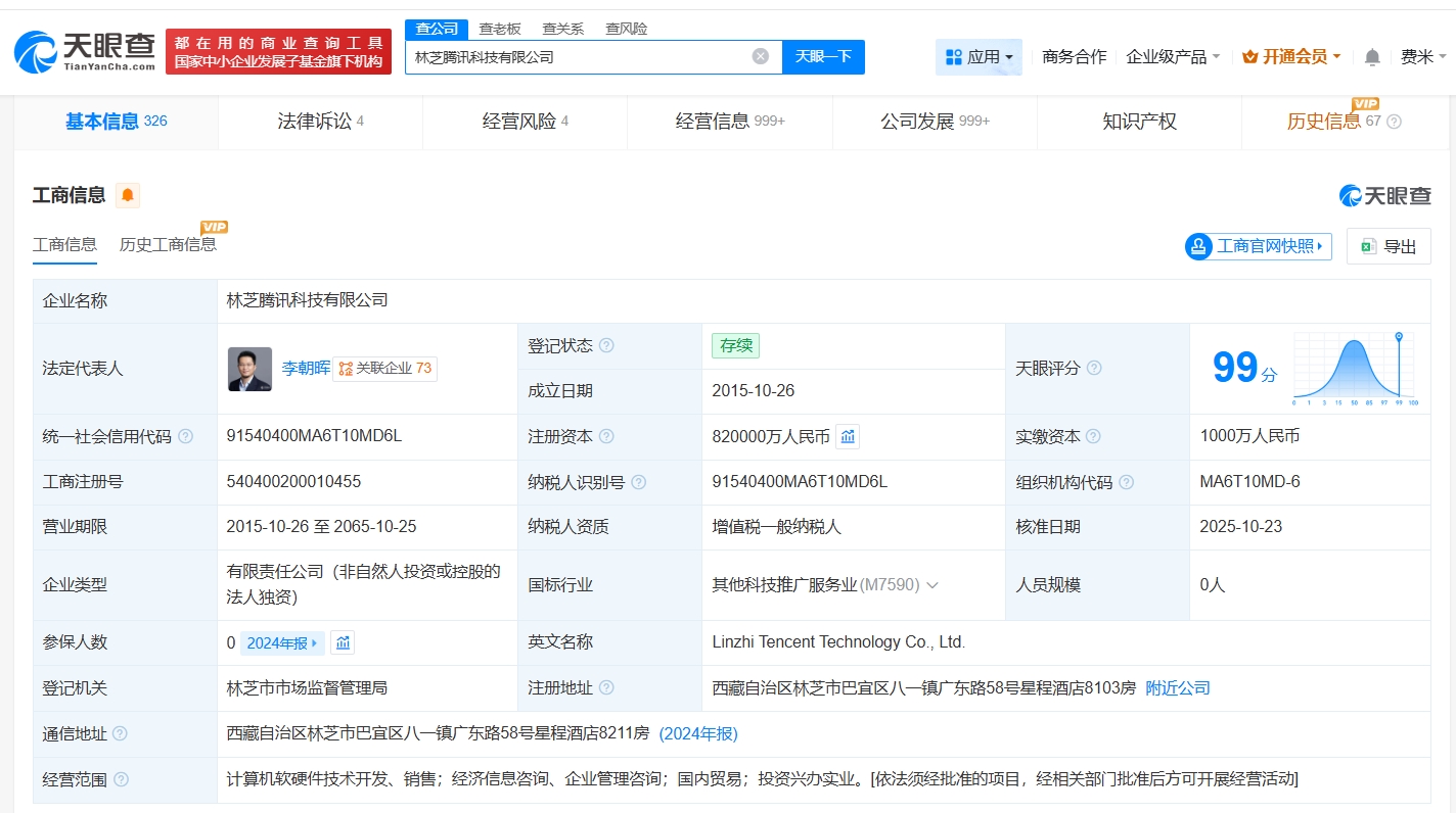 林芝腾讯科技有限公司成立于2015年10月,法定代表人为李朝晖,注册资本82亿人民币,经营范围为计算机软硬件技术开发、销售,经济信息咨询、企业管理咨询,国内贸易,投资兴办实业,由深圳市腾讯睿见投资有限公司全资持股。