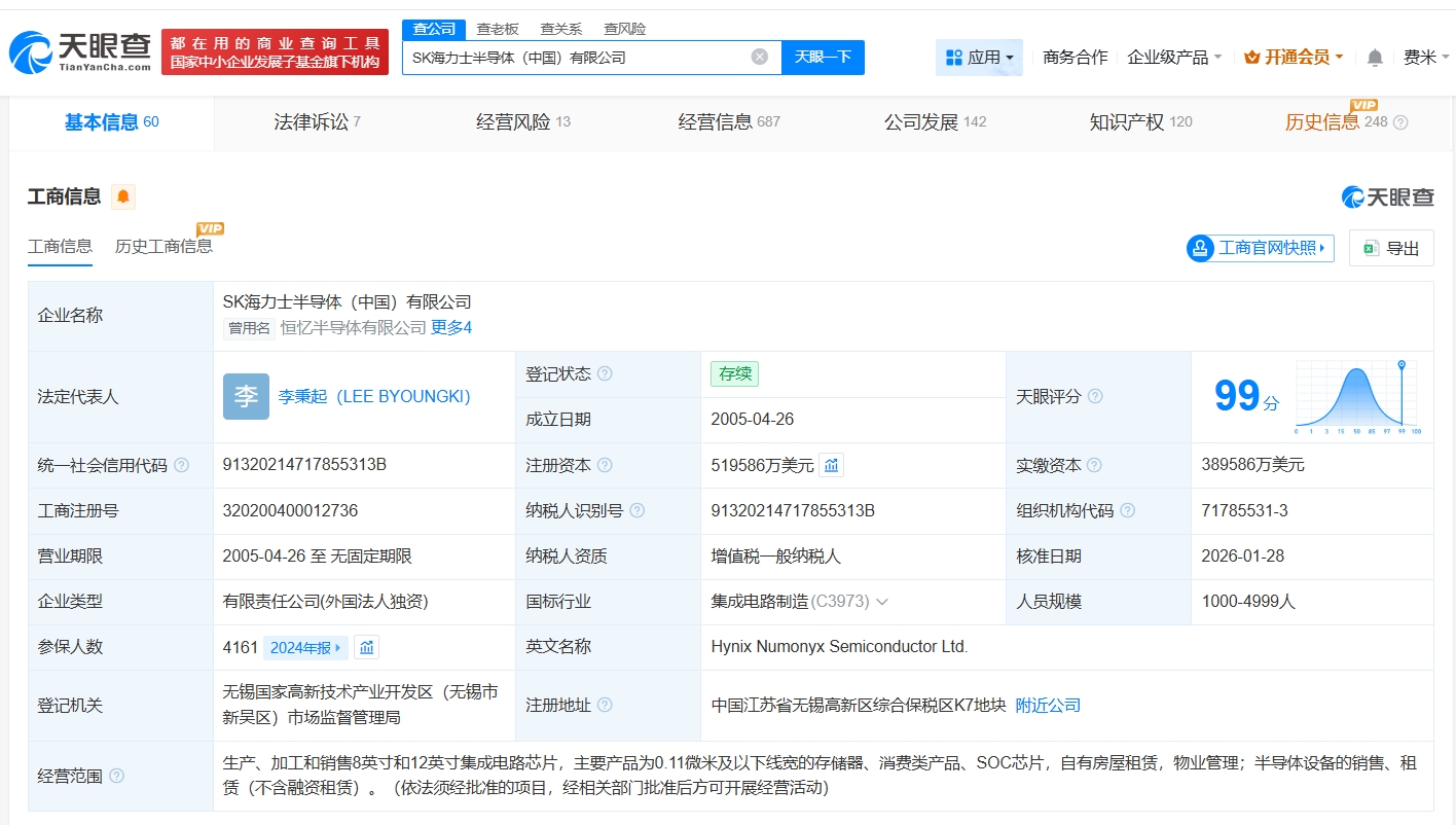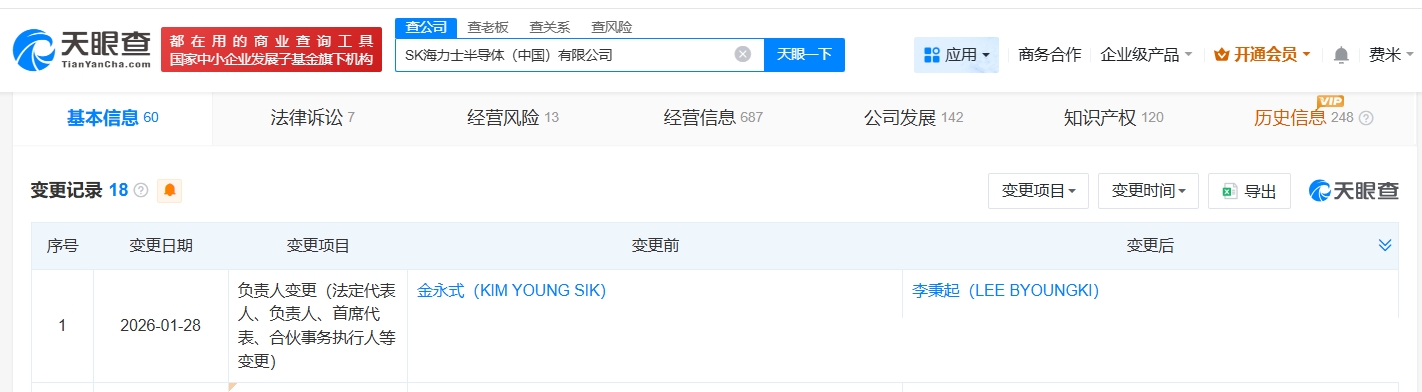 雷达财经讯,天眼查App显示,近日,SK海力士半导体(中国)有限公司发生工商变更,金永式(KIM YOUNG SIK)卸任法定代表人、董事长,由李秉起(LEE BYOUNGKI)接任。