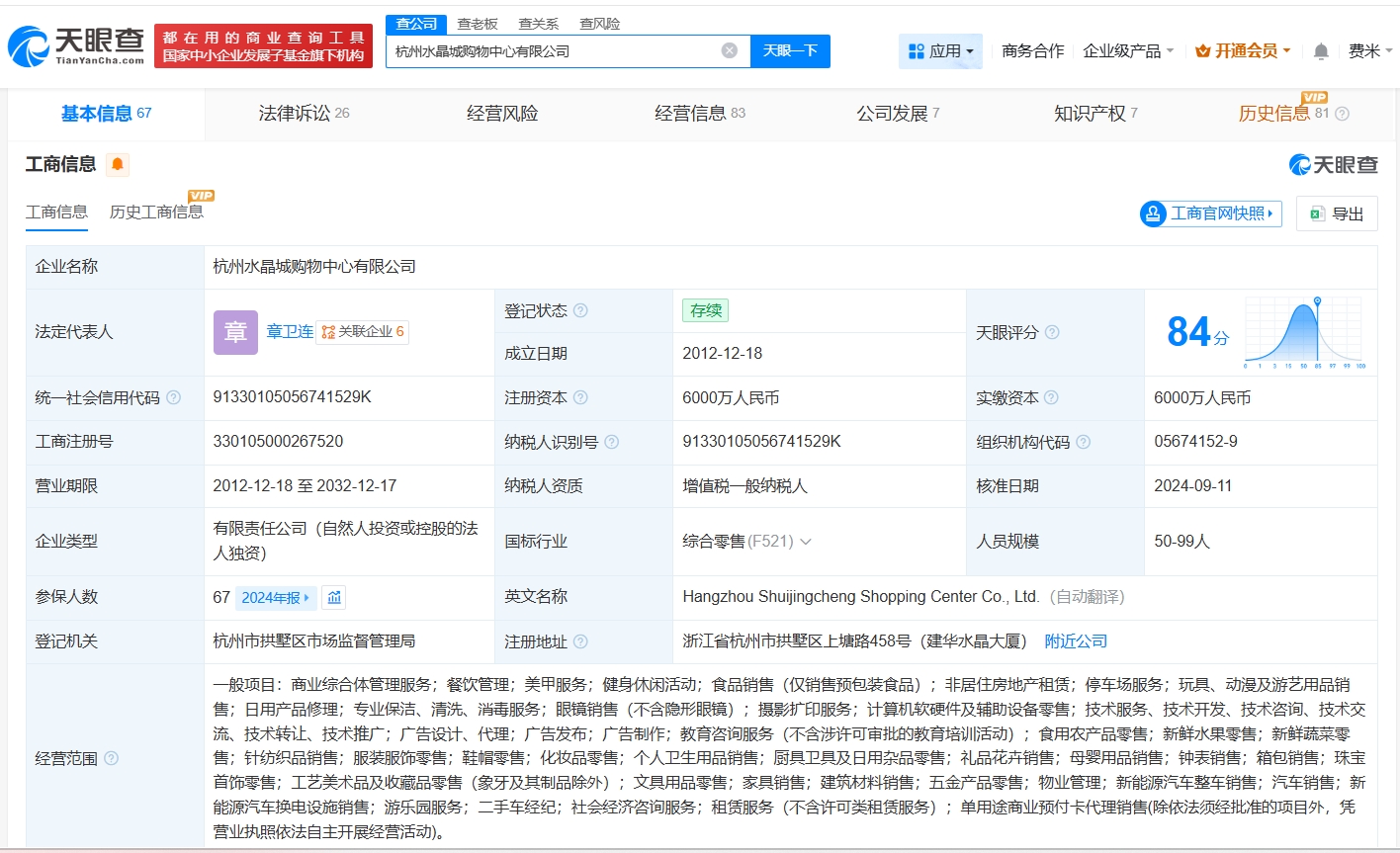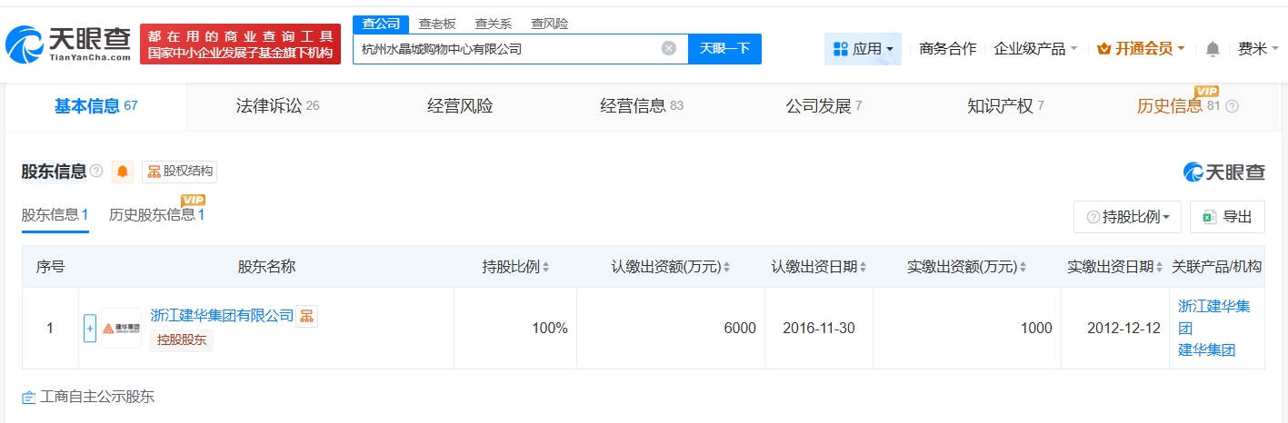 天眼查App显示,涉事商场关联公司杭州水晶城购物中心有限公司成立于2012年12月,法定代表人为章卫连,注册资本6000万人民币,经营范围包括商业综合体管理服务、餐饮管理、美甲服务等,由浙江建华集团有限公司全资持股。法律诉讼信息显示,该公司曾因合同纠纷、买卖合同纠纷、追偿权纠纷等被起诉。