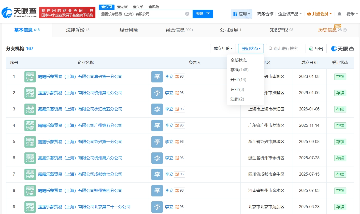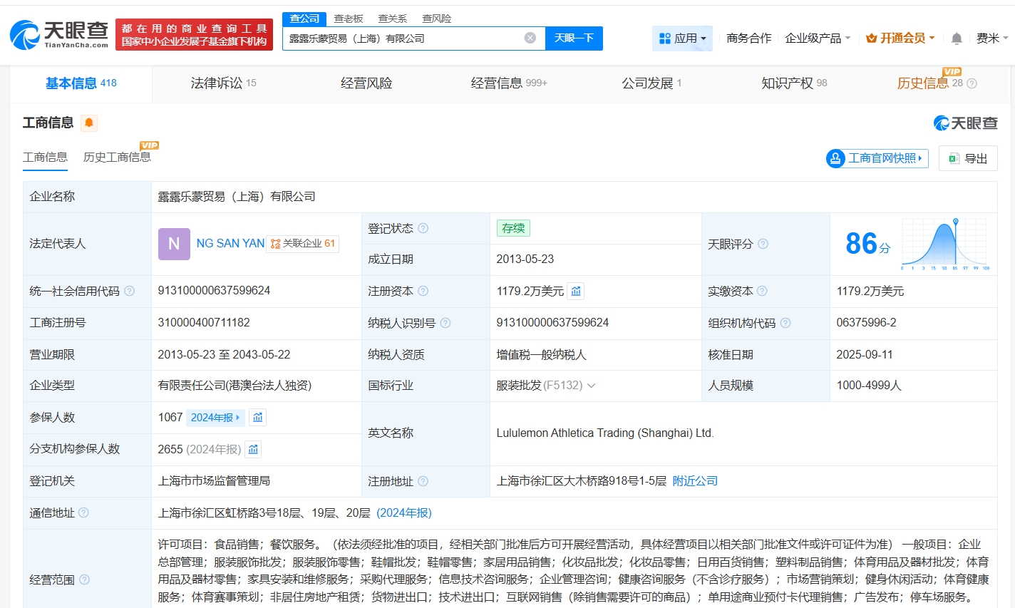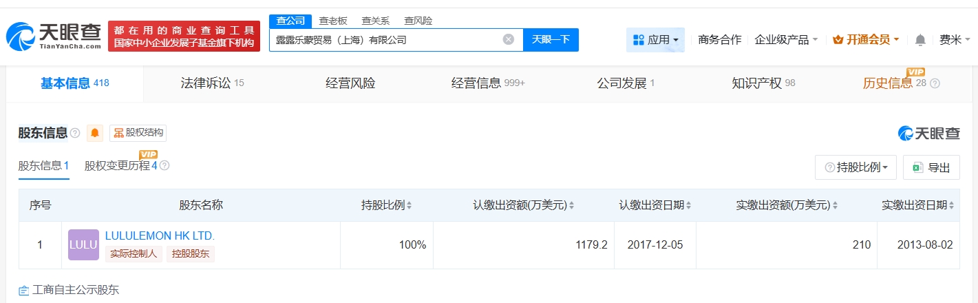天眼查App显示,Lululemon中国关联公司露露乐蒙贸易(上海)有限公司成立于2013年5月,法定代表人为NG SAN YAN,注册资本1179.2万美元,经营范围包括食品销售、餐饮服务、企业总部管理等。股东信息显示,该公司由LULULEMON HK LTD.全资持股。分支机构信息显示,该公司拥有超160家分支机构。