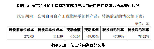 据第二轮问询回复文件,自研自产转换后,臻宝科技该业务单位成本从转换前的272.03元降至111.39元,降幅达59.05%,该公司将其归因于OEM采购模式向自研自产模式转变,认为自研自产优化了产品成本结构,从而实现了成本大幅下降。