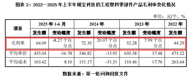 招股书及两轮问询回复文件显示,2023年,臻宝科技的工程塑料零部件业务收入为4333.12万元,毛利率为52.28%;2024年,该业务收入同比下降4.3%至4145.03万元,毛利率却一次性跳升20.07个百分点至72.35%;2025年上半年,收入进一步断崖式下跌39.10%(按年化计算),仅为1262.19万元,毛利率仍顽强守在64.09%的高位,较2022年的44.29%高出近20个百分点。