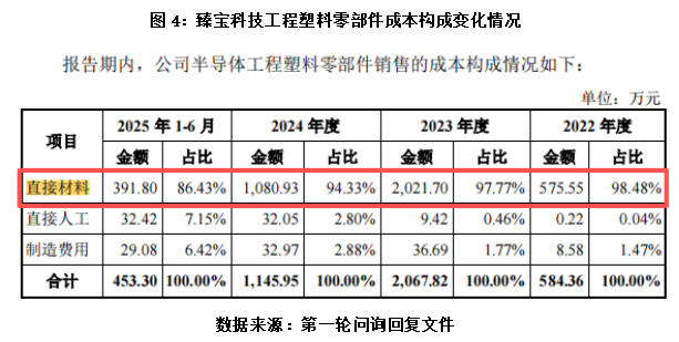 第一轮问询回复文件显示,2023年,臻宝科技就开始自研自产工程塑料零部件,自产产品销售成本占比为2.99%。2024年自产产量大幅提升,自产产品销售成本占比上升至23.21%。2025年上半年,其自产产品销量继续提升,自产产品销售成本占比由23.21%上升至36.48%。